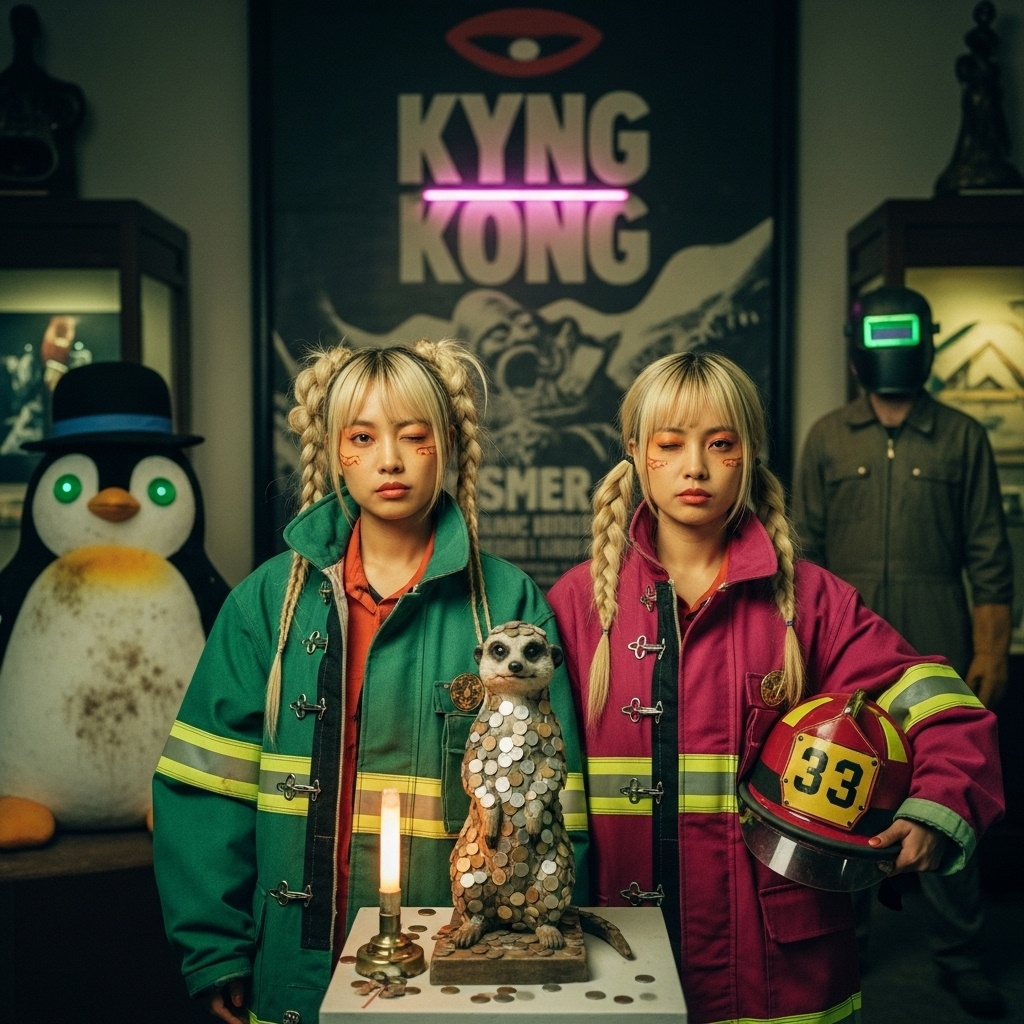 [Style: J-Pop/Idol Metal, Industrial Funk, City Pop, Ska-Punk, Lead Female Vox (A, HARU): Shifts from sweet, high-pitched J-Pop to raw, powerful Yakuza-Punk rock vocals, Backing Female Vox (Kabuto Twins): Childlike, high-pitched, energetic, almost taunting call-and-response chants over heavy sections, Virtuosic, percussive slap-bass, Driving, complex Candombe-Industrial-Ska-Metal drums, Explosive, heavy metal guitar riffs during breakdowns, Weeping Bandoneón, soaring strings, soulful Harmonica, Incredibly danceable, fun, and commercial on the surface, but with a deep, sinister, and magical undertone, Extreme dynamic shifts, ~135 BPM, ]