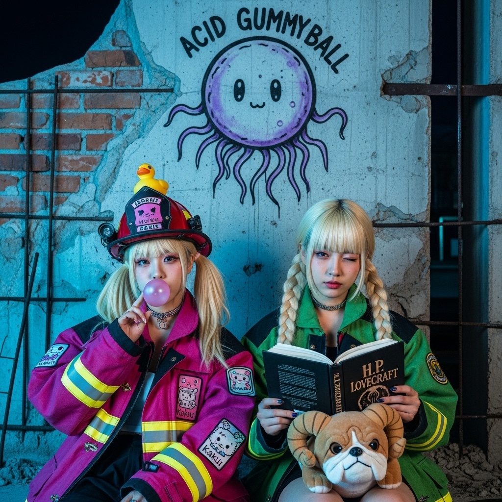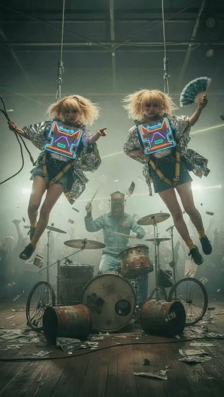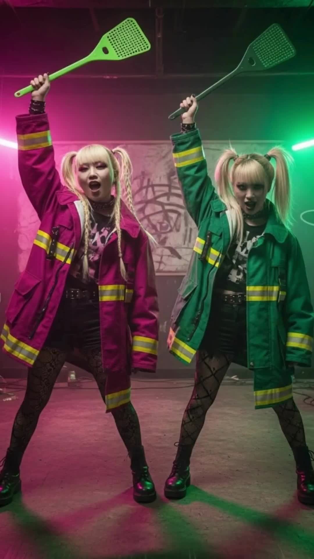 [Style: J-Pop/Idol Metal, Industrial Funk, Hardcore, Lead Female Vox: Twin high-pitched, energetic, "kawaii" vocals, Guest Male Vox: Rhythmic harmonica beatbox, Music features a heavy, driving industrial funk beat, explosive heavy metal guitar riffs, a virtuosic and percussive slap-bass, and catchy chiptune/8-bit synth hooks, The mood is a chaotic, fun, and aggressive fusion of a children's TV show opening and a brutal metal concert, A brain-breaking, viral, and extremely danceable "mosh-pit party" anthem, ]