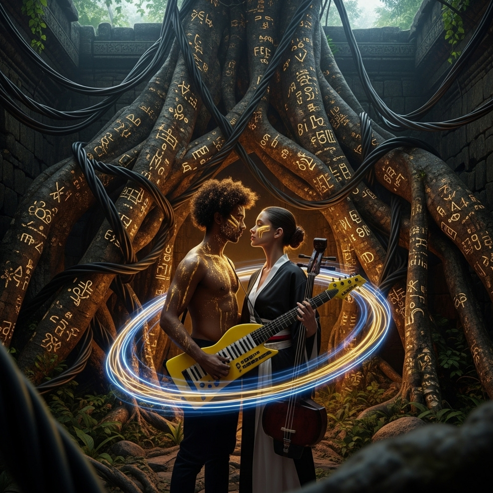 [Style: FEMALE VOX (J-Pop Idol sweetness EXPLODES to raw Yakuza-Punk-Metal power & dramatic/mystic theatricality; Japanese/Rioplatense Spanish hooks); MALE VOX (smooth cool alt-pop/indie; experimental jazz/house KEYBOARD/SYNTH solos & spoken word/rap); 90s ANIME/MOVIE ANTHEM (iconic catchy energy, cosmic dread, ultra-cool cinematic feel; Shonen opening power), SIGNATURE TRIBAL-TECHNO-INDUSTRIAL DRUMS (insane Candombe/Metal/Hip-Hop/Ska-Punk/Breakbeat fusion; heavy glitch; VIRTUOSIC HARMONICA BEATBOX lead; unique EDR/XION production power; COWBELL/OLD BARRELS), DEMONICALLY VIRTUOSIC SHAMISEN (funk-punk-ska-oriental explosion; extreme technicality/raw energy), DEEP P-FUNK BASS, WEEPING/RAGING BANDONEÓN, GRITTY DISTORTED GUITAR, SOARING STRINGS, EERIE THEREMIN, Massively viral, unforgettable, brain-breaking, mosh-pit/dance-battle/karaoke ANTHEM; disgustingly commercial yet intellectually sharp; global hit, ~130-160 BPM (dynamic shifts, genre-bending)