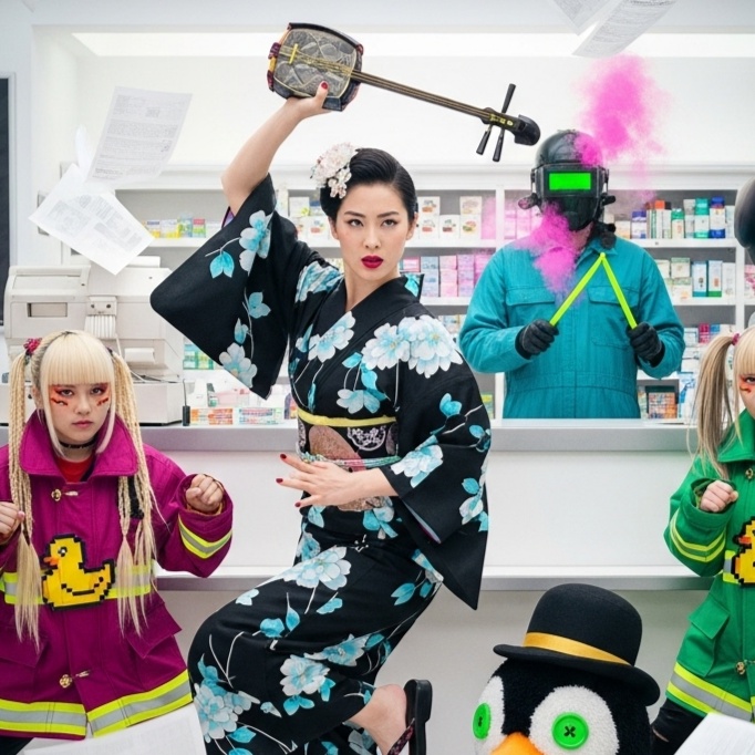 [Music Style: Theatrical J-Metal Country Funk, A high-energy, infectious fusion of twangy Country-Western guitars and frantic Kawaii Metal energy, Driven by a powerful, tribal beat of heavy Taiko drums, Features a constant duel between a soulful, traditional Shamisen and a chaotic, groovy Cello, The track must be incredibly catchy, like a viral pop anthem hiding a dark, looping narrative, ]