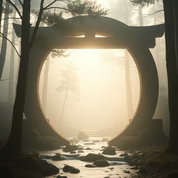 Sparse and spacious, sounds appear and dissolve naturally, large sacred reverb like a shrine, forest, or mountain, water and bells weave softly