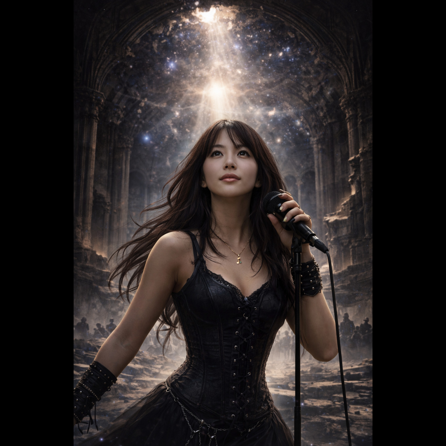 Epic symphonic metal, gothic cinematic, 6–7 minute song, Instrumental orchestral intro 30–40 seconds, no vocals, Female lead 23, Japanese vocal tone, operatic range, emotional belts, controlled vibrato, no screaming, Verses intimate and steady in 4/4, Chorus massive and sustained with layered choir harmonies, Orchestral interlude mid-song, Bridge drops to piano and solo vocal then explodes into final double chorus, Full orchestra: strings, brass, timpani, cinematic percussion, Wide dynamic range, professional cinematic mix, vocals forward and precise