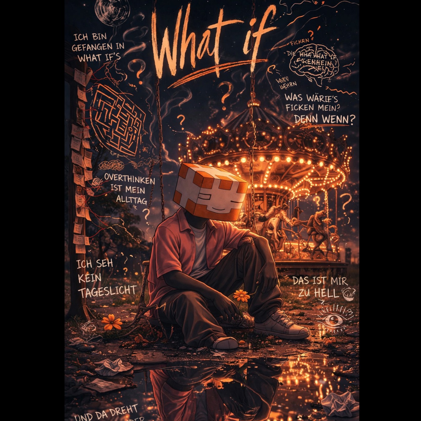 German Pop-rap, 120 BPM, baritone lead vocals, spoken intro, tight kick-snare groove, swung 16th hi-hats, melodic sub-bass, piano ostinato, glockenspiel accents, string stabs, chamber choir pads, half-time chorus, tape hiss, plate reverb, stereo widening, compressed drums, bittersweet triumph, whistling layered in the vocals