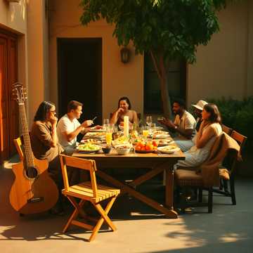 American country fused with Argentine folk rock fusion, Acoustic guitar, bombo legüero drum, warm fiddle, Male and female vocals trading verses, blending in harmonies, Country twang meets Latin American warmth, Strummed rhythms with gaucho folk energy, Intimate storytelling verses build to full ensemble chorus, Moderate tempo, swaying and celebratory, Bridge slows with emotion before building to joyful group finale, Multilingual, heartfelt, like a cross-continental hootenanny around the asado