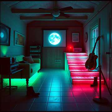 upbeat Cosmic Country fused with Ambient Techno, West Coast Desert Psychedelia, Twangy Pedal Steel Guitar floating over a deep, pulsing Electronic Bass and warm Synth Pads, Acoustic guitar strumming with a steady, hypnotic Motorik drum beat, Ethereal, reverb-heavy vocals