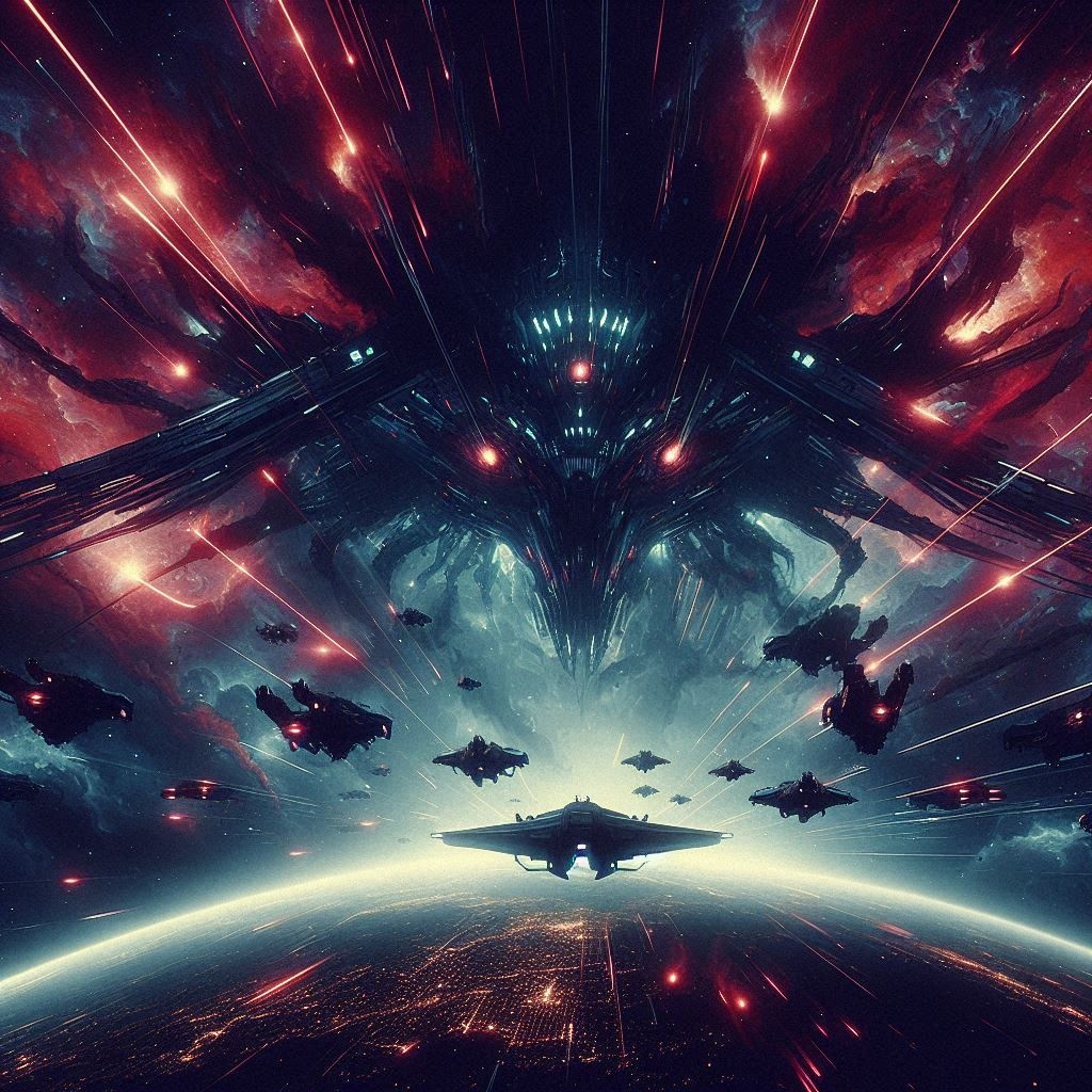 Space Opera orchestral epic, [Intro] alien fleet dark menace raising, [Verse] lasers, explosions, [Chorus] bass silent male choir whisper, [Cresendo] enemy flagship destroyed, Victory fanfare