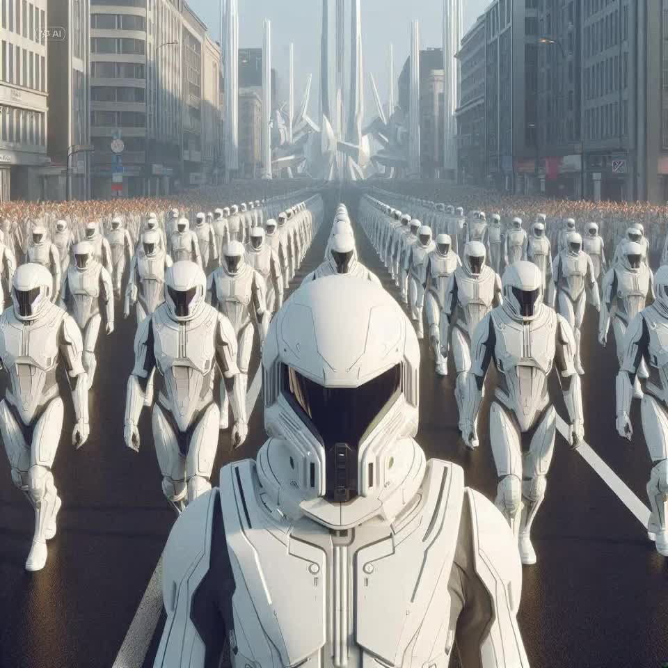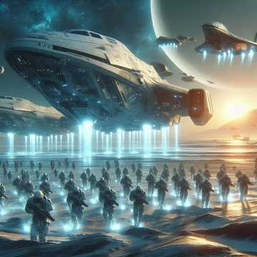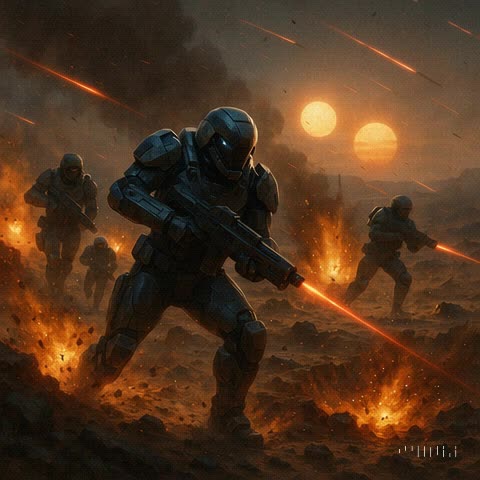 scifi ground battle, intense and powerful intro, ballad, military march, weapons fire, cinematic, martial, Fast and varied tones, chase, battlesounds, fight, Sad and melancholic outro, battle