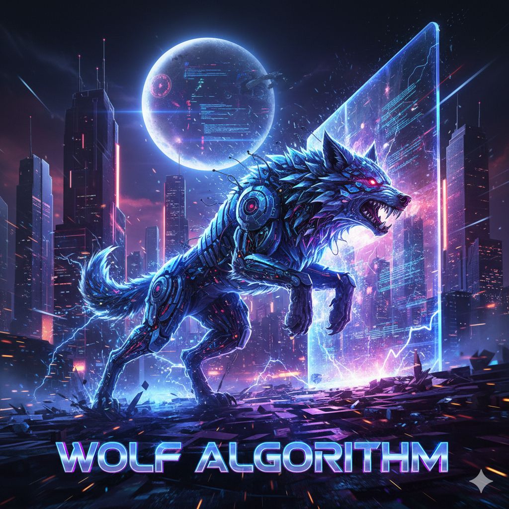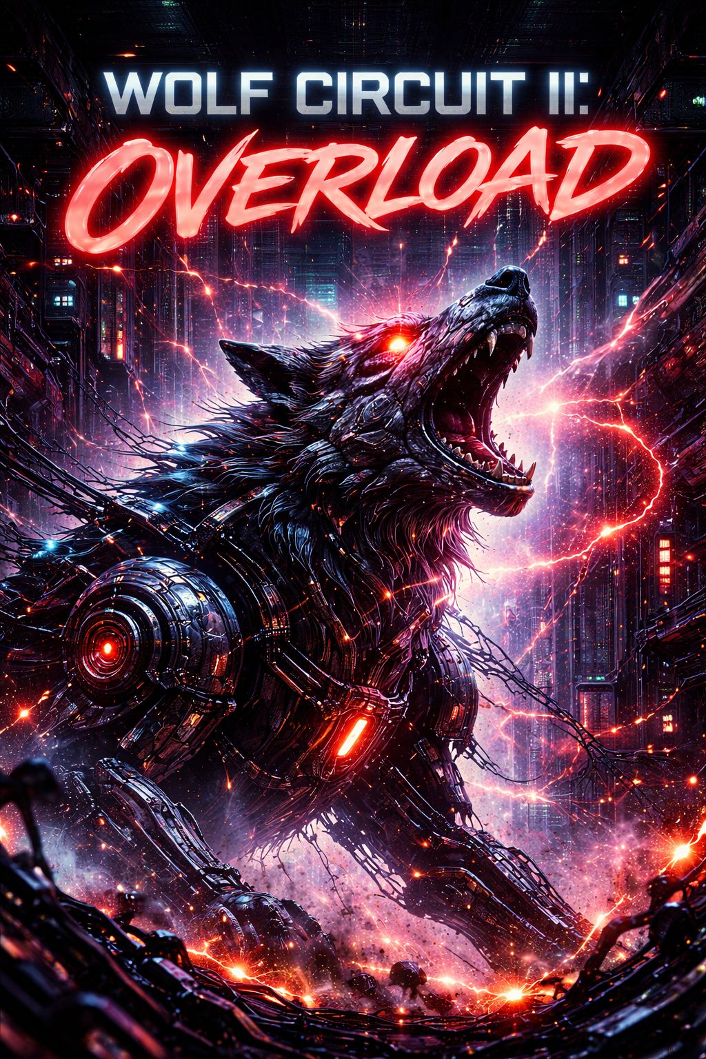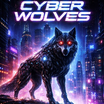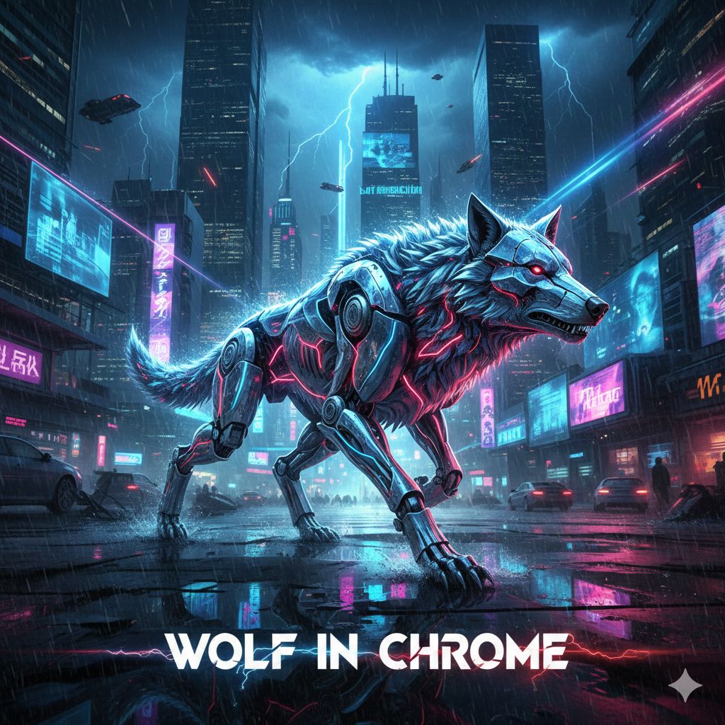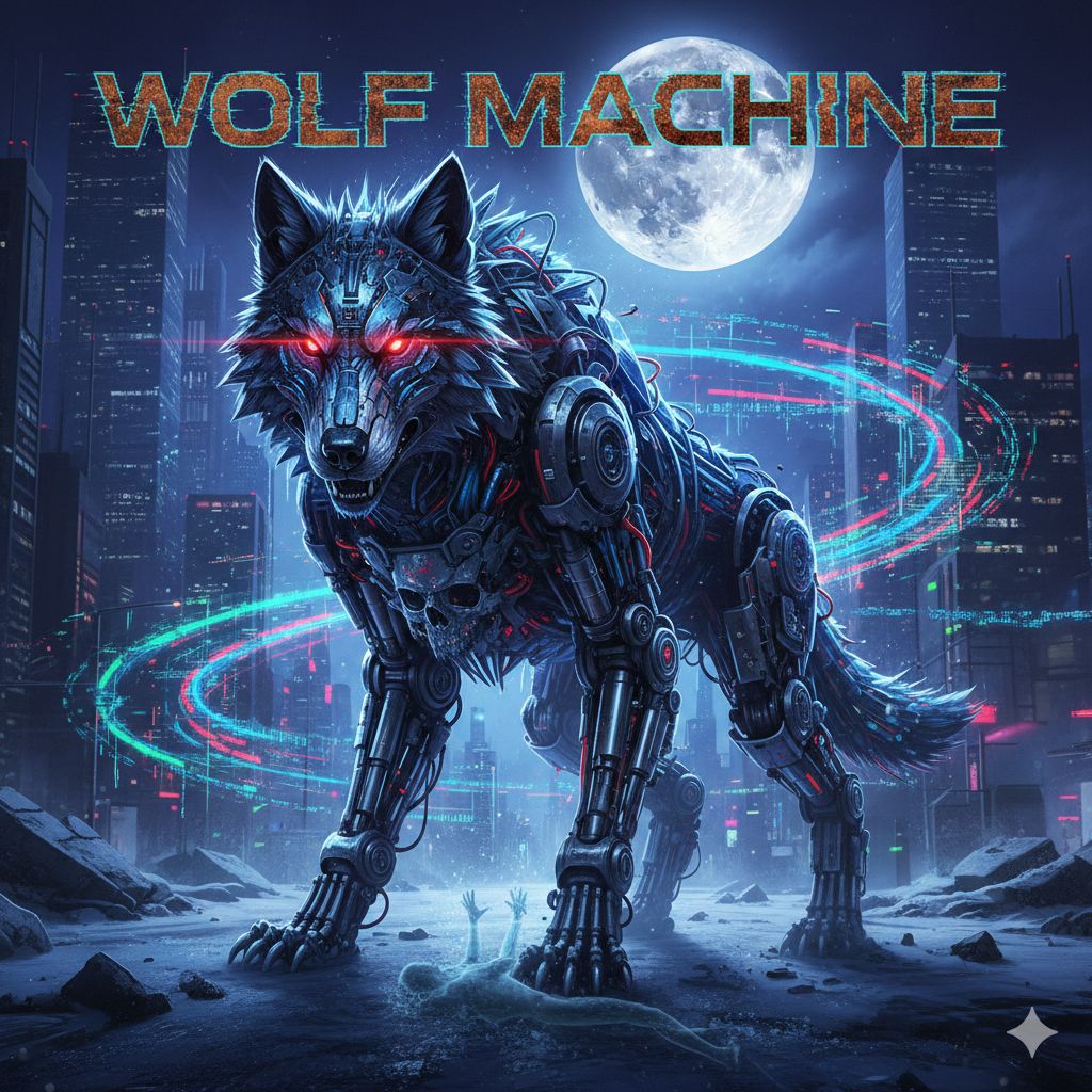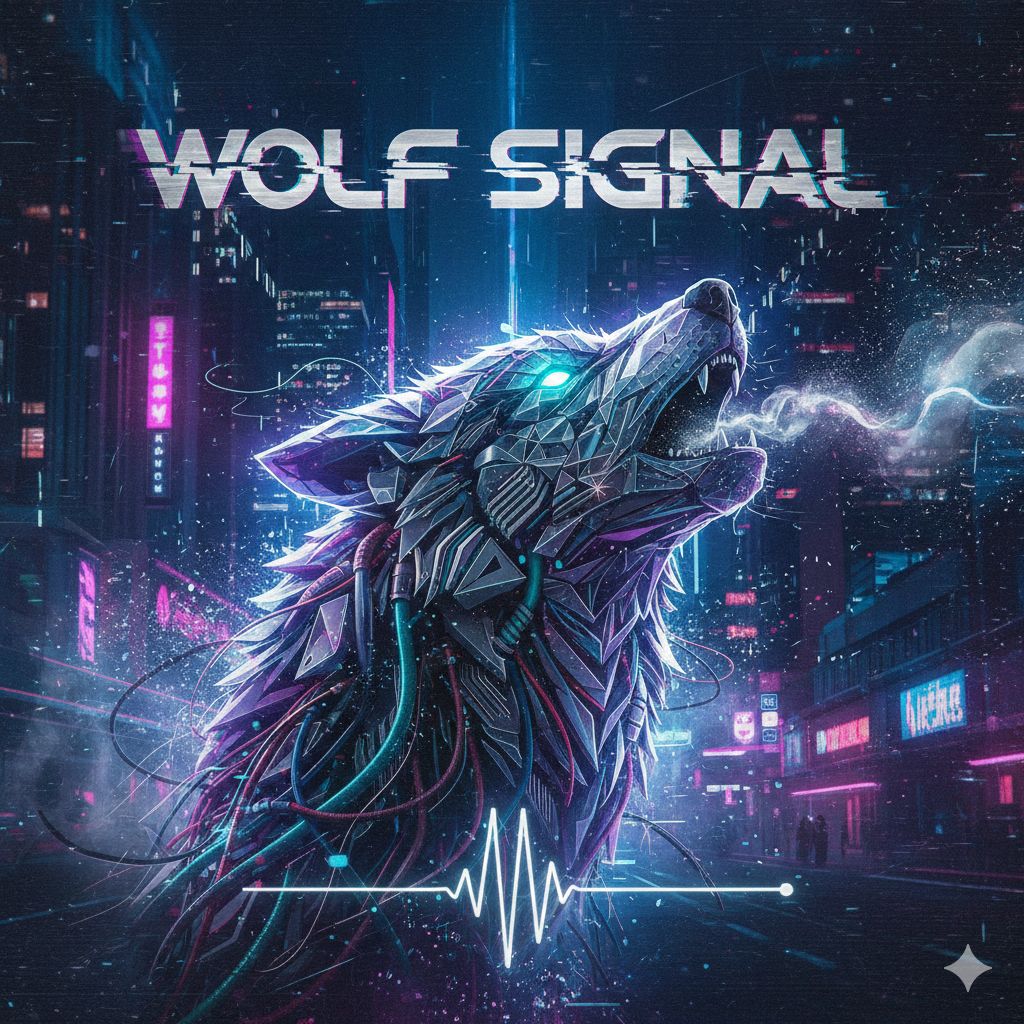 Dark industrial ambience with glitching digital noises, rising distortion, robotic breathing, and a distant metallic wolf howl, Industrial Techno / Rock hybrid, Aggressive cyberpunk energy, Heavy distorted bass, pounding techno kick (130–140 BPM), mechanical percussion, glitch effects, dark synth arpeggios, and crushing industrial guitars, Robotic processed vocals mixed with gritty rock vocals, Chaotic drops, digital stutters, and intense build-ups, Futuristic dystopian atmosphere, cybernetic wolf theme, neon-lit megacity vibe, Massive distorted chorus with robotic chants and howls, Inspired by industrial metal and dark techno but cinematic and modern, Overloaded, glitchy, powerful sound design with explosive drops and heavy rhythm