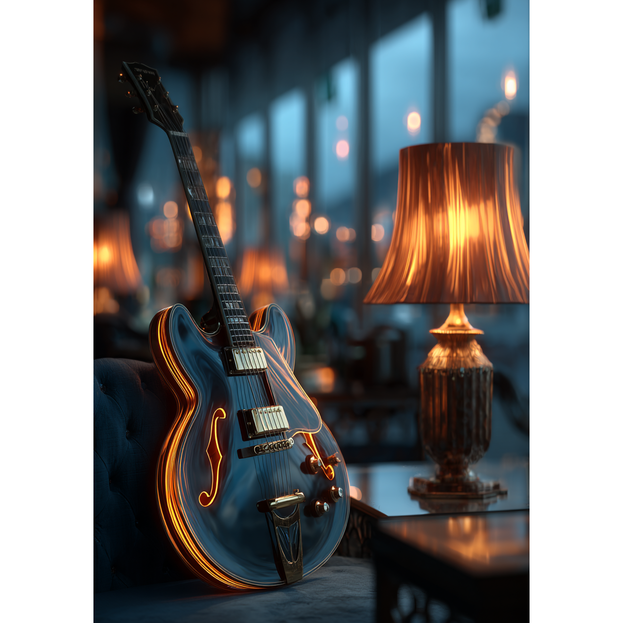 A slow and stylish jazz fusion instrumental at 70 BPM, featuring smooth electric guitar as the lead, supported by mellow keys, soft bass, and laid-back drums with a punchy, prominent kick drum, Designed for a nighttime lounge atmosphere—cool, refined, and subtly groovy, Structured as intro → main theme → guitar solo section → outro, Ideal for chic bars, urban nights, and relaxed conversations, gently fading into the city’s midnight silence