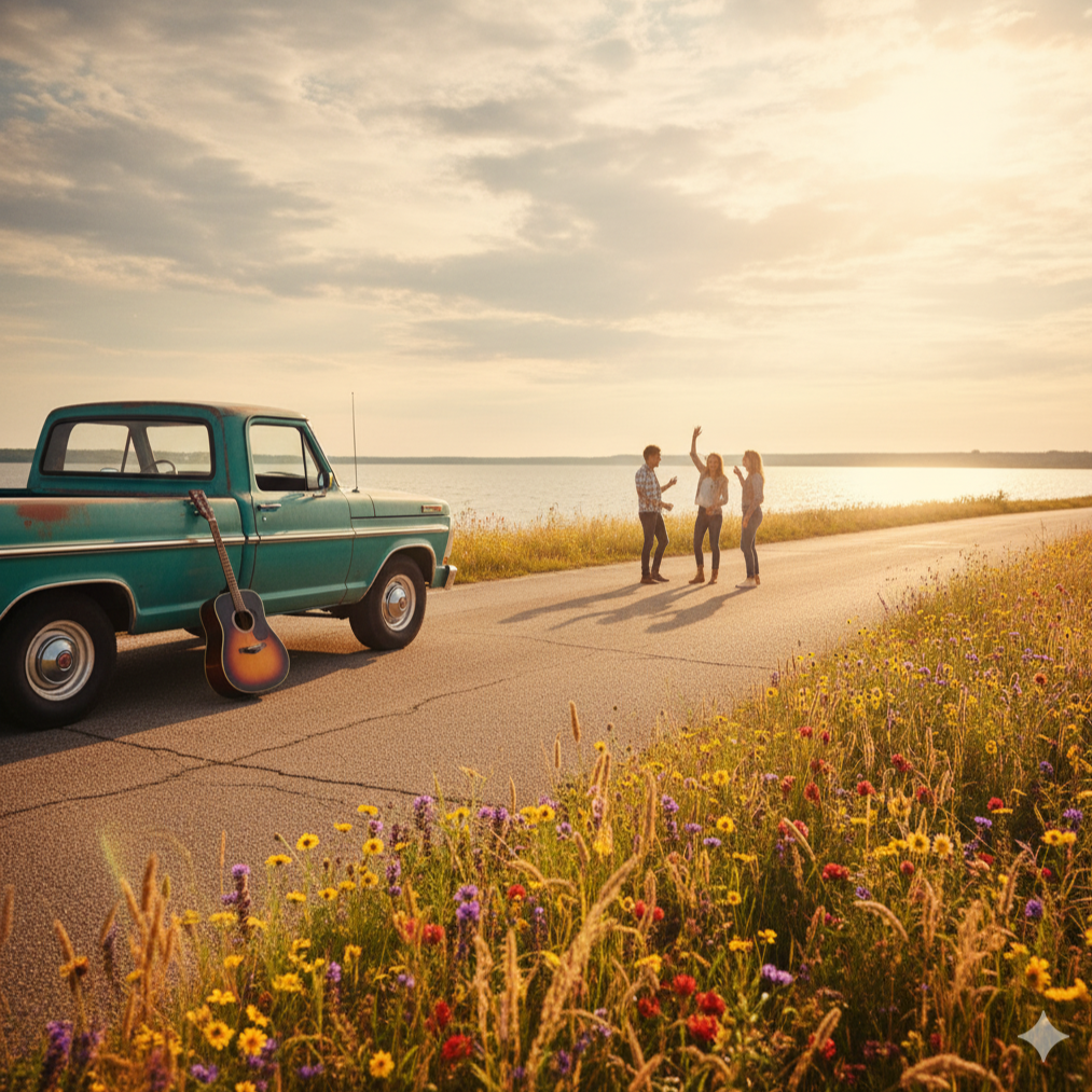 Mood: Energetic, playful, sing-along chorus, lighthearted instrumentation (acoustic guitar, stomps, claps, maybe a harmonica/banjo), Scene Context: Ethan and his buddies cruising down dirt roads, lakeside hangouts, beers at the diner, laughing about nothing
