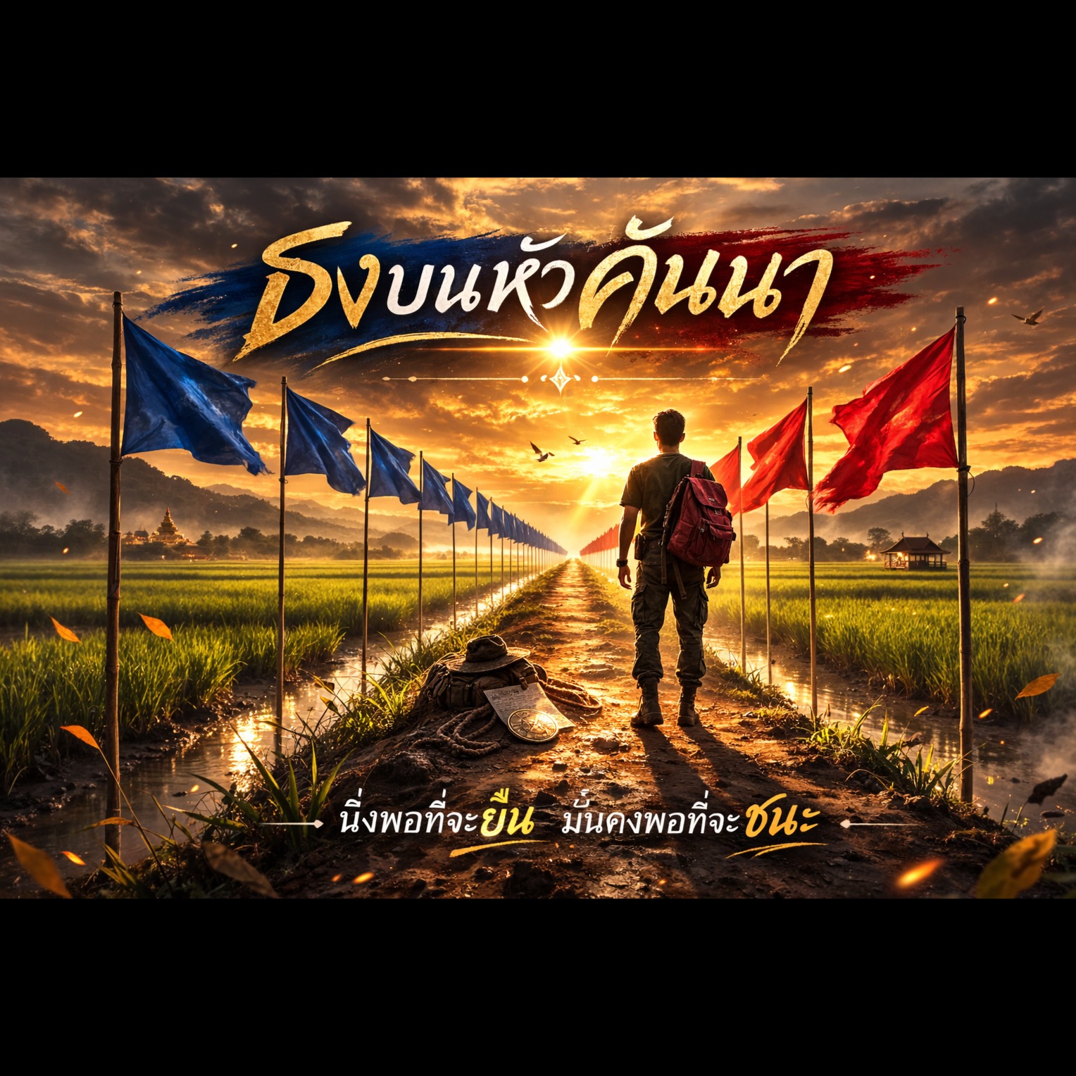 Song Concept: “ธงบนหัวคันนา” – Flags in blue and red lined up along a rice field ridge, symbolizing discipline and inner fire, A story about standing firm, organizing one’s energy, and preparing for long-term victory, No politics, No hype, Just steady courage and self-mastery, Energy Direction: Build gradually from grounded verse to strong, memorable chorus, Keep groove tight and forward-moving, Suitable for live band performance feel