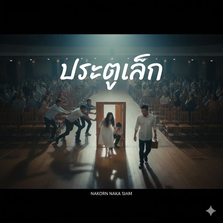 Thai contemporary phuea chiwit folk rock titled “ประตูเล็ก”, Strong acoustic guitar rhythm with subtle overdriven electric guitar, steady live drums with confident groove, warm bass, spacious but powerful mix, Mature emotional male vocal, deep, grounded, calm yet commanding, Not dramatic, not aggressive — strong through stillness, Avoid first-person pronouns; universal storytelling style, Theme about walking into a crowded room with quiet confidence, choosing not to compete, letting a young woman step through a narrow door first, Symbolizes dignity, inner strength, leadership without ego, and power that does not rush, Build from steady, reflective verses into a bold, memorable chorus with strong rhythmic lift, The chorus should feel wise, masculine, and timeless — firm but not loud, End solid and resonant, like a man who stands without needing to prove anything