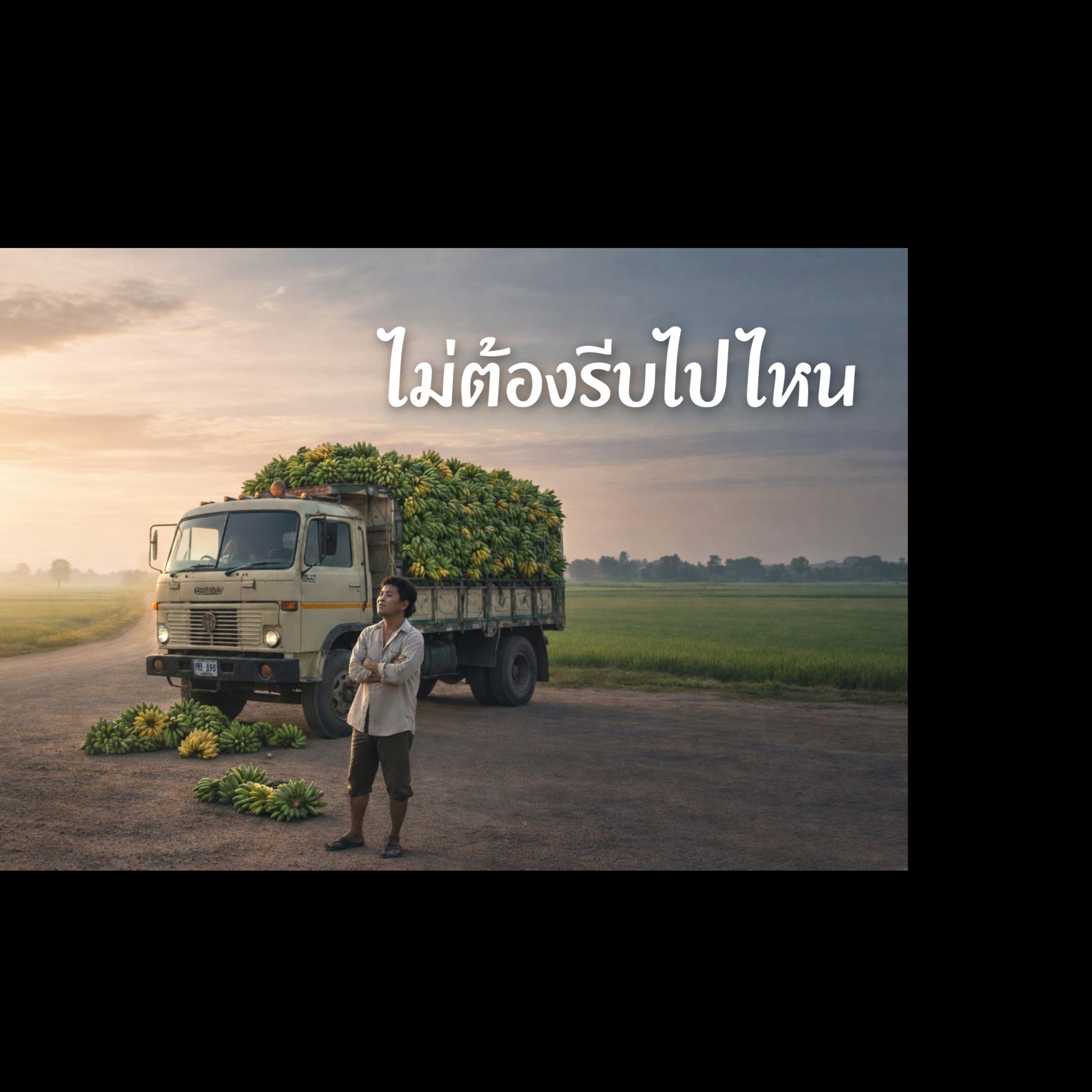 Thai contemporary phuea chiwit / folk song titled “ไม่ต้องรีบไปไหน”, Warm acoustic guitar, soft percussion, subtle traditional texture, Emotional mature male vocal, calm and sincere, Mood reflective, spacious, inspirational, Avoid using first-person pronouns; write in a universal storytelling style so listeners feel the song is about their own life, Theme about dreaming of driving a truck full of ripe bananas on an open road, symbolizing abundance, patience, and freedom from time pressure, Message: stop chasing, trust timing, let success arrive naturally, Build gradually into a powerful, memorable chorus that feels timeless and wise