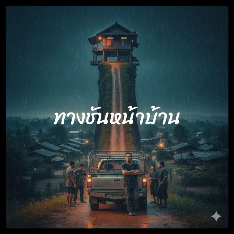 Arriving home at night in the rain, the house standing high, the road too steep to enter, Rain falls but does not touch the body, Instead of forcing the way, choosing to redesign the path into a gentle slope, A dream about understanding, patience, and finding a better way forward, Mood like the final scene of a Thai film — quiet, thoughtful, and hopeful