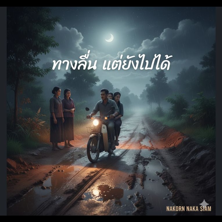 Start intimate and minimal, Build gradually with deeper percussion and cinematic strings, Chorus must lift emotionally but not shout aggressively — powerful yet grounded, Bridge soft and reflective, Final chorus fuller instrumentation, layered backing vocals humming, Theme: Slippery road after rain as metaphor for life responsibility, Not dramatic, not tragic — resilient, steady, quietly strong, No English lyrics, Only Thai