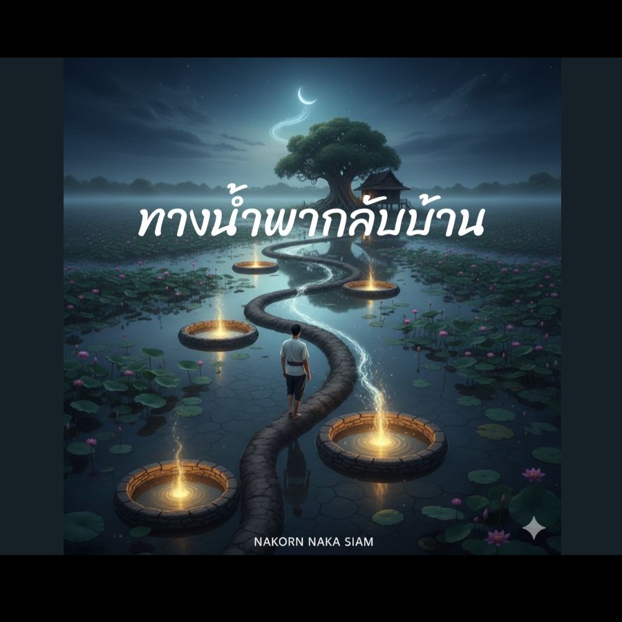 Create a mystical–warm Thai folk fusion song inspired by a recurring dream of returning home through water and land, Tempo medium, calm breathing rhythm, steady and grounded, Tone sacred, gentle, reassuring, not dark, not dramatic, Story imagery: familiar rice fields seen many times in dreams, a large ancient water pond behind the birthplace, and a voice saying “pass five great ponds and you will reach home, ” The singer suddenly realizes and softly says “oh… it truly connects to my home, ” Theme: remembrance, destiny, ancestral pathways, water as a guide, land as memory, Instrumentation: phin as main melodic lead, bamboo flute (khlui) answering phrases, soft khaen or harmonic drone, light hand percussion, subtle cinematic pad underneath, Spacious, rural, timeless, Vocals intimate, humble, storytelling, emotionally restrained but deep, Chorus should feel like inner recognition rather than celebration — a quiet awakening, Atmosphere: dusk light, irrigation water flowing, sacred