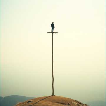 Thai cinematic folk with mystical epic atmosphere, medium tempo around 95 BPM, male Thai vocal deep and emotional, Theme: a man standing balanced on a tall T-shaped wooden pole high above the ground, symbolizing inner balance and calm strength, Instruments: acoustic guitar fingerstyle, Thai flute (khlui), soft drums, cinematic strings and gong accents, Mood spiritual, powerful yet calm, like discovering inner balance while others watch in awe, Chorus uplifting and epic, bridge atmospheric with echoing flute, ending with calm reflective guitar and wind ambience