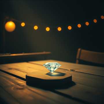 Thai Cinematic Folk with spiritual atmosphere, Tempo around 90 BPM, mid-slow but flowing, Mood reflective, sacred, calm wisdom, Male Thai vocal warm and deep, clear Thai pronunciation, emotional but restrained, Instruments: acoustic guitar fingerstyle, Thai flute (khluay), soft bass, light percussion, subtle strings, Song about a diamond resting quietly on a wooden table at night; it shines with great value but the singer feels calm and does not rush to take it, Theme of understanding value without greed, quiet wisdom, spiritual reflection, Build gently toward the chorus with cinematic lift, flute echo and soft guitar solo ending
