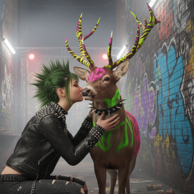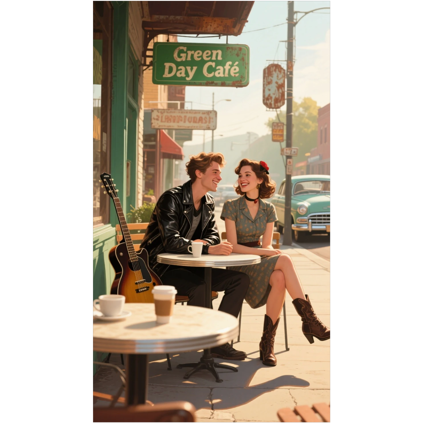 Energetic fusion of early British rock’n’roll and punk energy — bright electric guitars with crunchy overdrive, punchy drums, and lively handclaps driving the rhythm, Catchy vocal harmonies and call-and-response “yeah yeah yeah” choruses blend with raw, youthful punk vocals full of attitude, The tempo is fast and exciting, mixing the joyful charm and melodic bass lines of early rock with the edgy power chords and rebellious drive of modern punk, Clean vintage tones meet gritty distortion, creating a sound that’s fun, romantic, and defiant — like dancing and shouting under the neon lights of a garage party