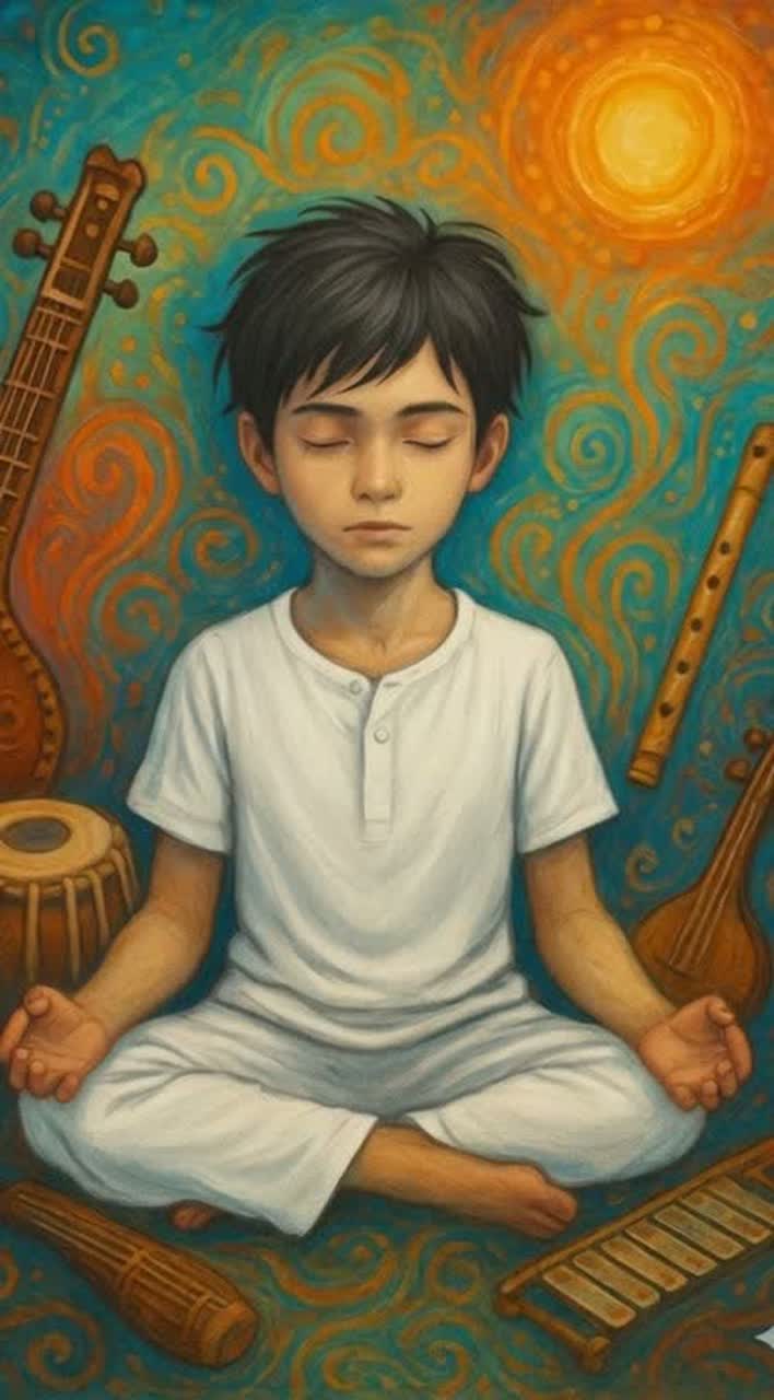 Bangla, Indian Pop Rock, minor key, 86 BPM, boy lead vocals, vibrant sitar melodies, tabla and dholak rhythms, bansuri flute harmonics, sarangi accents, electric guitar with subtle distortion, melodic bass, shimmering synth pads, glockenspiel highlights, energetic yet contemplative, lush Indian orchestral textures, immersive soundscape blending traditional Indian instruments with modern pop-rock energy