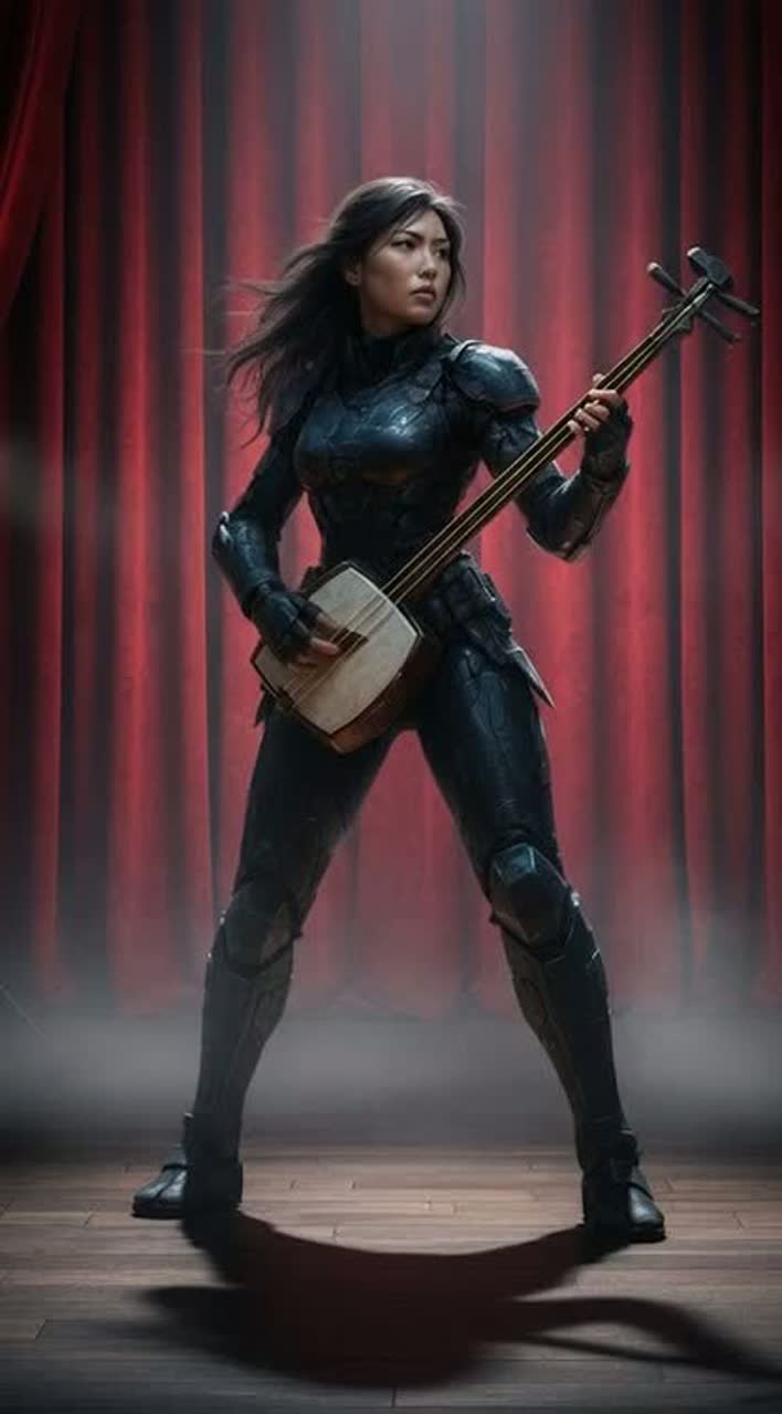 Cyberpunk Rock, Minor, 178 BPM, female alto lead, female soprano chorus, shamisens struck with strong bachi, shamisens with three-finger picking, percussive shamisens, cinematic shamisen textures reflecting space combat and transformation, dynamic interludes for battle and transformation sequences, epic finale conveyed solely through shamisen performance, soaring melodic lines and rhythmic intensity created exclusively by shamisen techniques