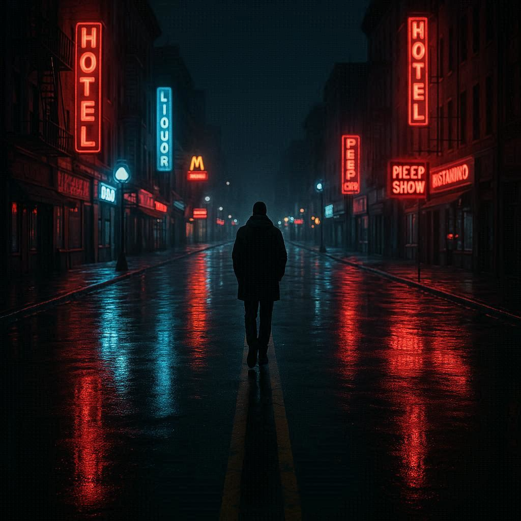 · Beat: A heavy, punchy Boom Bap drum loop with a swing/laid-back rhythm, Crisp, sparse snares, · Bass: A deep, distorted 808 bassline that provides a dark, pulsing foundation, · Textures: Vintage analog warmth, dusty vinyl samples with audible crackle, tape saturation, subtle glitch effects on vocal chops, · Melody: Dark ambient synth pads, filtered horn stabs, layered orchestral samples for a cinematic feel, Minimal, sparse guitar plucks in the bridge, · FX: Airy reverb, tape delay tails, subtle car sounds panning in the background for atmosphere, -- Vocal Direction --