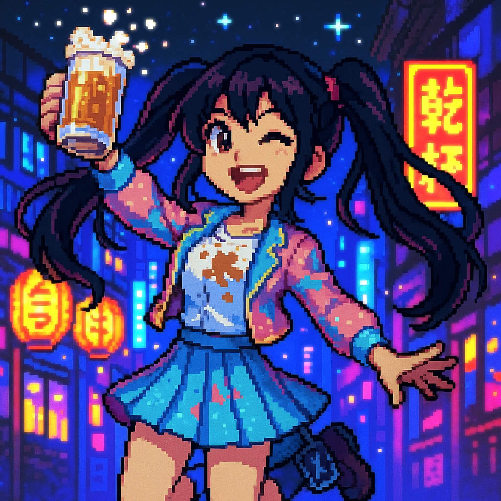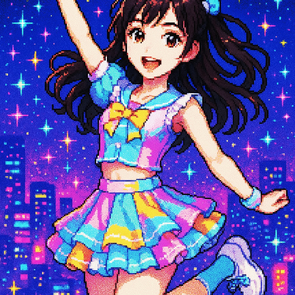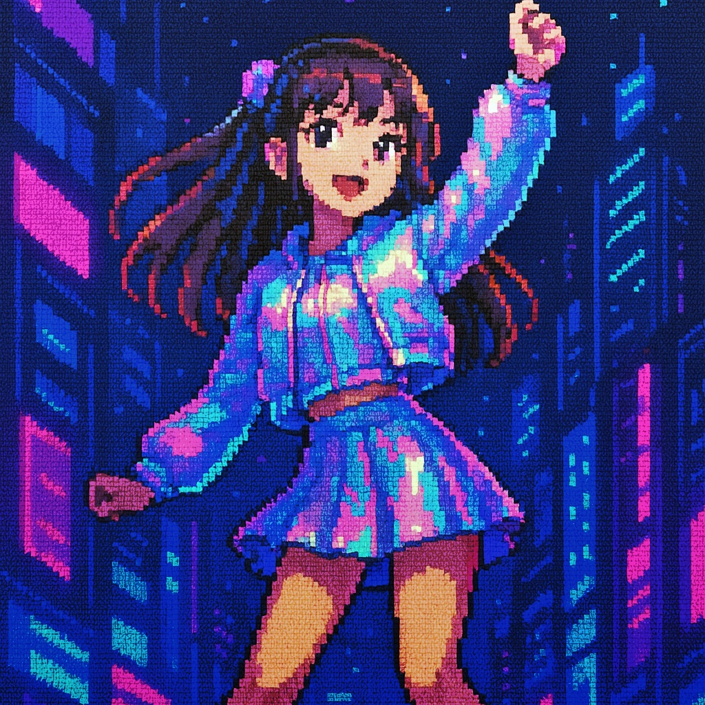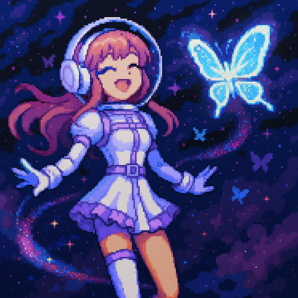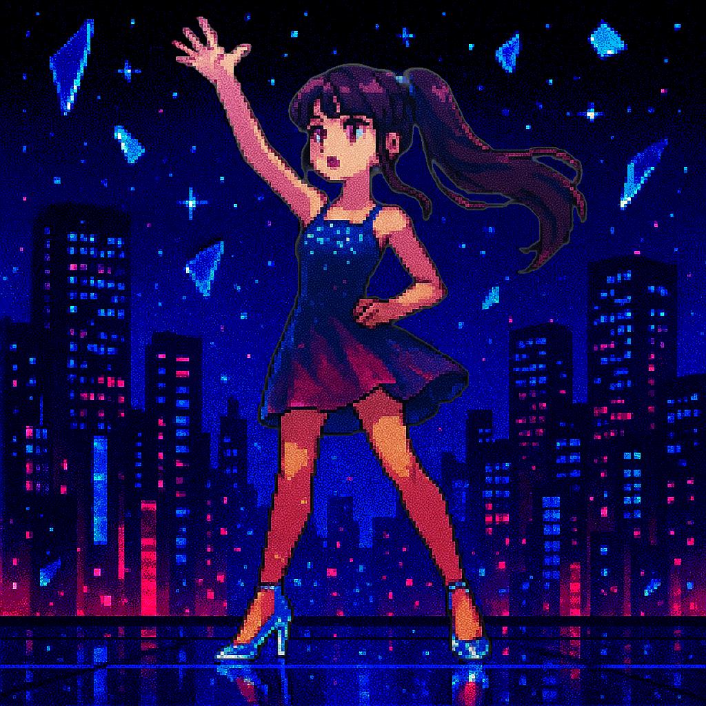Style: Glossy Japanese kawaii Electro-Pop / Future Disco, 128 BPM, key F♯ min, Drums – four-on-floor kick, crisp snare, bright 16-hat, airy clap, Bass – rubbery syncopated synth bass, octave hops, side-chained, Synths – supersaw chords, glitter 16th arpeggio, FM pluck fills, Lead – pentatonic saw riff with slides; chopped *wordless* vocal shots, FX – reverse cymbal, vinyl down-lifter, bit-crush rise, wide noise, Form