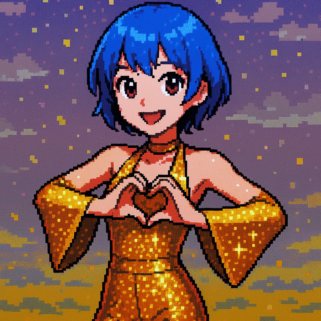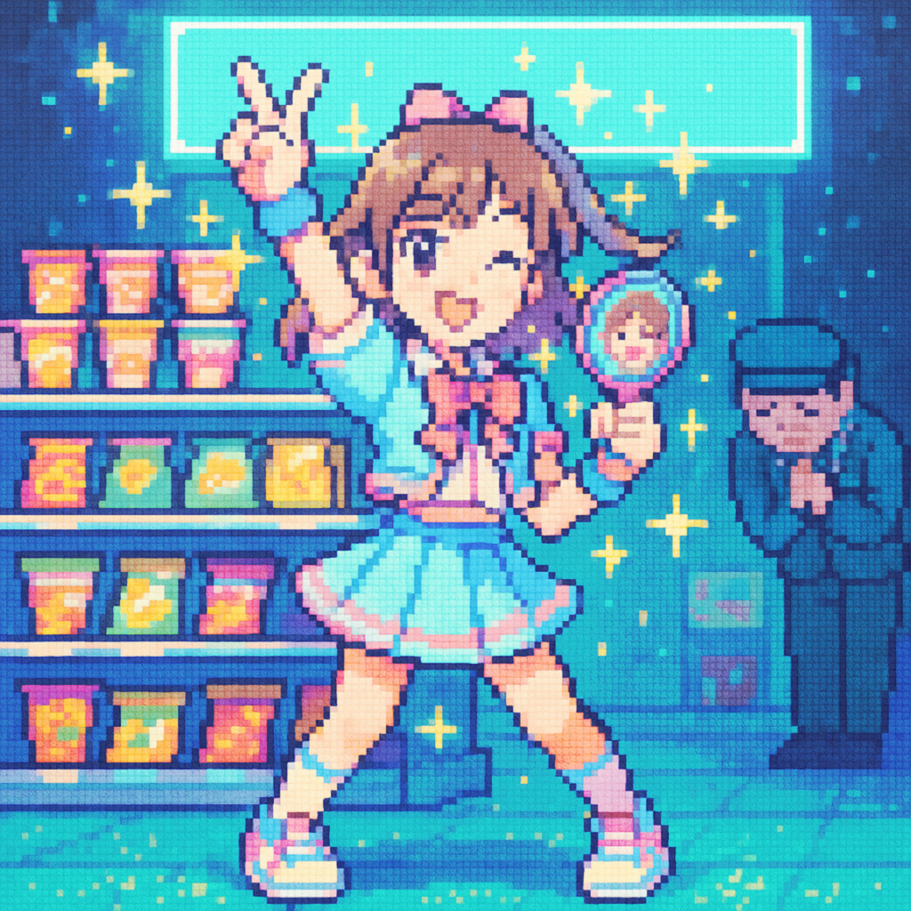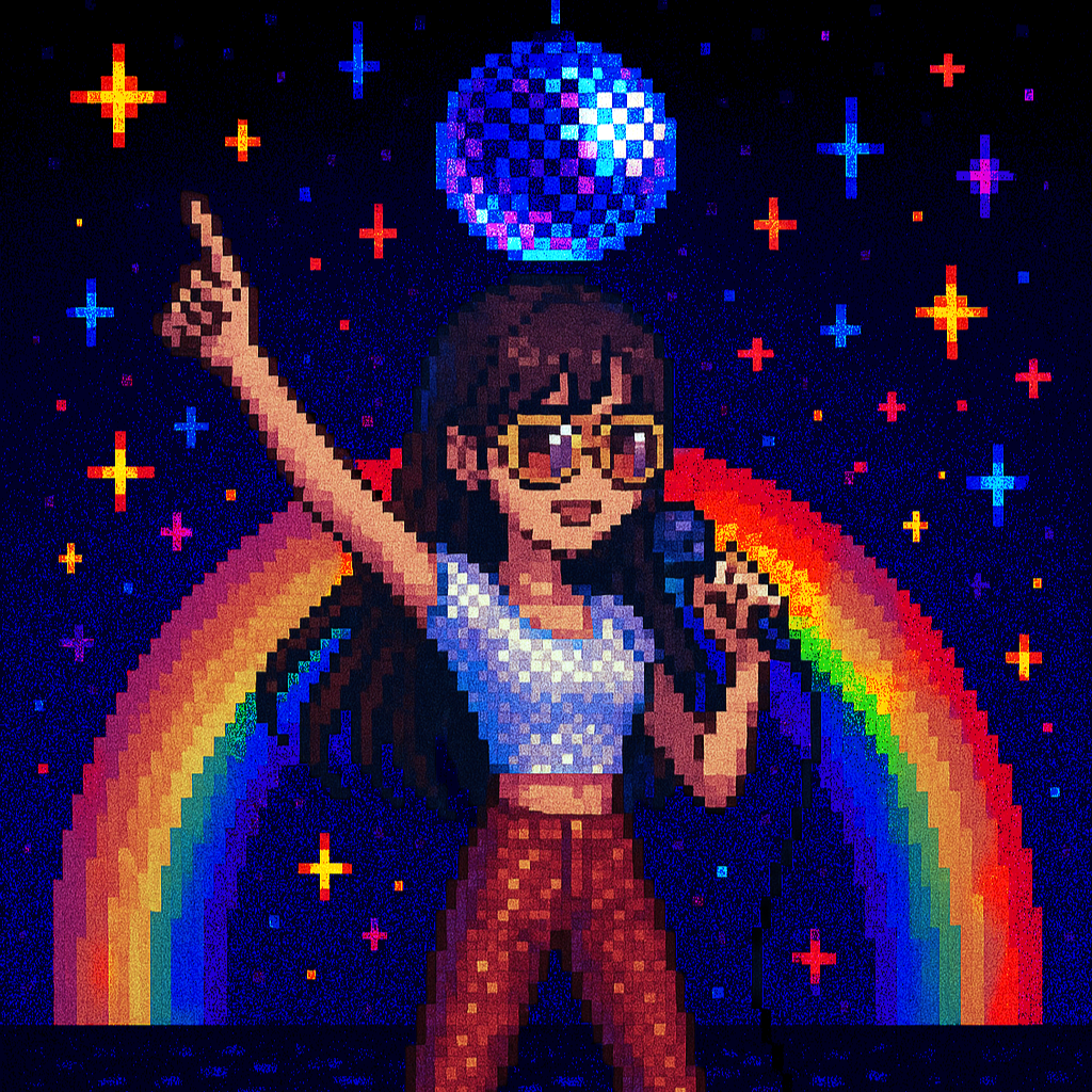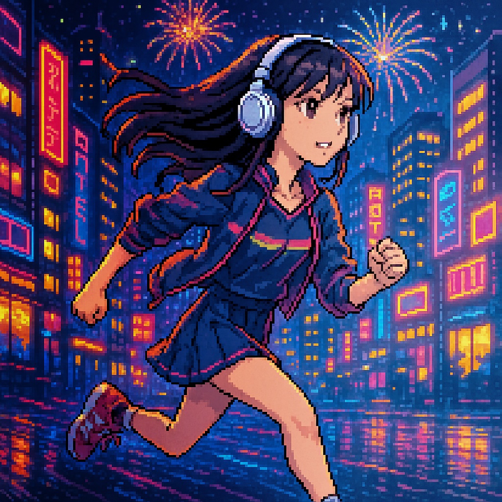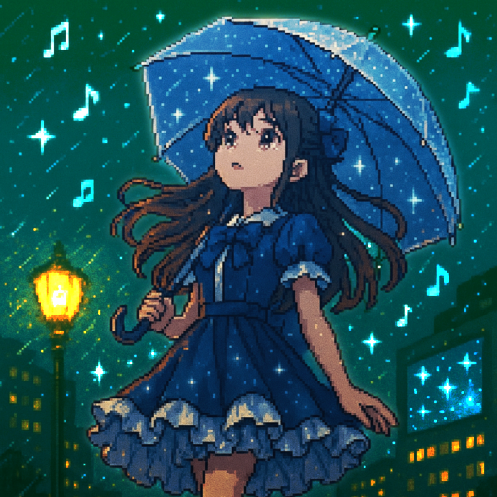 Style: Glossy Japanese kawaii Electro-Pop / Future Disco, 128 BPM, key F♯ min, Drums – four-on-floor kick, crisp snare, bright 16-hat, airy clap, Bass – rubbery syncopated synth bass, octave hops, side-chained, Synths – supersaw chords, glitter 16th arpeggio, FM pluck fills, Lead – pentatonic saw riff with slides; chopped *wordless* vocal shots, FX – reverse cymbal, vinyl down-lifter, bit-crush rise, wide noise, Form