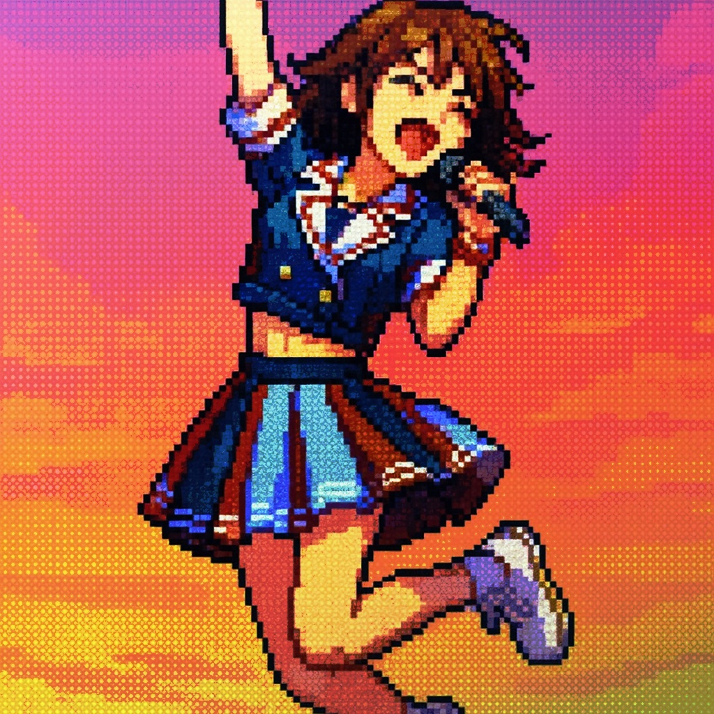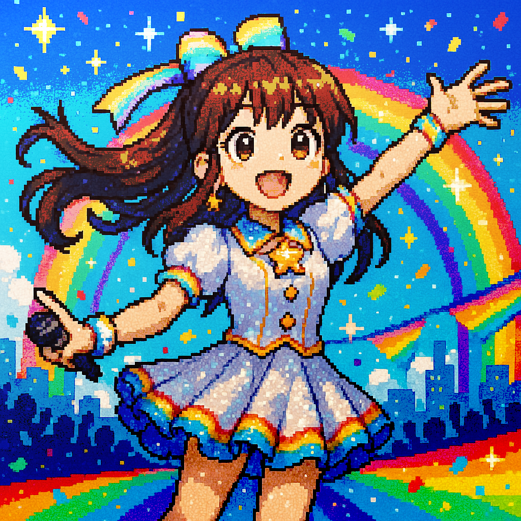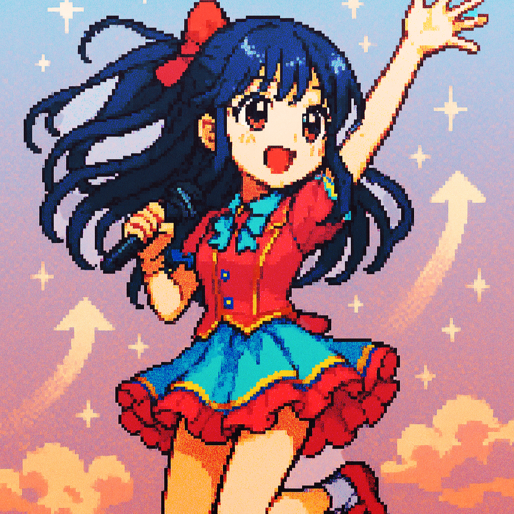 Vocals: Japanese female idol style, straight-tone (flat) delivery with minimal vibrato, bright head-voice, crisp Japanese diction, cute yet precise, Upbeat modern Japanese female idol pop track infused with ’90s East Coast hip‑hop vibes, Tempo: 95 BPM, Rhythm: boom‑bap drums (punchy kick, crisp snare), electronic claps, hi‑hats, and a funky synth bass, Melody: warm filtered synth‑horn loop, soulful jazz theme, kawaii chimes, and bubbly pads, Vocals: sweet layered female group harmonies; playful rap verses with call‑and‑response; melodic chorus featuring echoing vocal chops and ad‑libs, Structure: