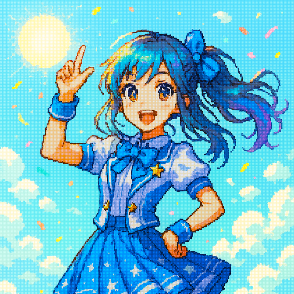 Create an upbeat J-Pop idol song flavored with late-90s R&B, Tempo 112 BPM, key of A-major, Drums: tight kick, crisp snare, bright 16th-hat groove, layered handclaps on 2&4, Bass: silky synth bass locking eighths with kick, Keys: glossy e-piano chords, airy pad swells, sparkly bell arp accents, Guitar: clean mute funk chops, Vocals: youthful female lead, light melisma, Backing: 3-part harmonies & crowd “Fu!” chants before chorus, Verse 2 hosts 8-bar semi-spoken male guest, Form: intro (hook synth) – verse – pre-chorus – big chorus – verse 2 – chorus – dreamy half-time bridge – double chorus with high harmony ad-libs – outro hook repeat to fade, Mood: confident, flirtatious, vibrant, Mix: bright reverb tails, gentle tape saturation, side-chain pulse on pads, Target length 3:30