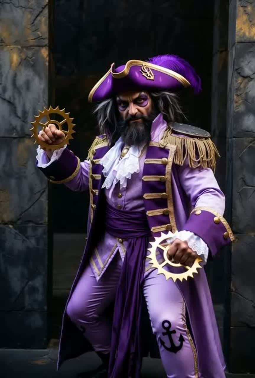Swashbuckling fantasy sea shanty fused with dramatic theatrical flair, charismatic male lead vocal with playful flirtatious tone, upbeat tempo, lively fiddle, light percussion snaps like chakram throws, layered harmonious backing for chorus, hints of pirate hornpipe rhythm, vibrant and adventurous 1980s-inspired adventure soundtrack feel, energetic and empowering