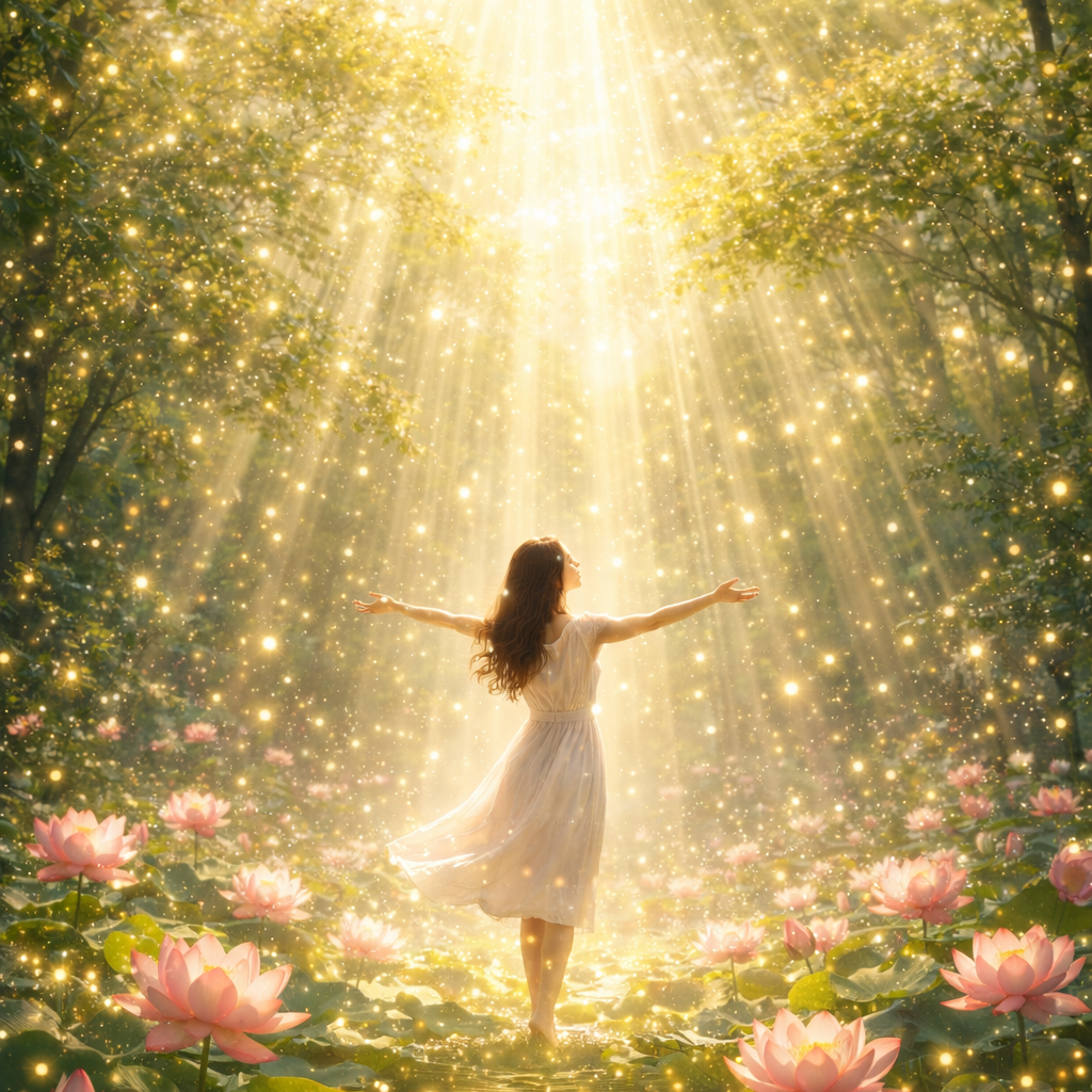 Female lead vocal with a slightly childlike, cute, and soft voice, Boy Vocals, Girl Vocals, Euphonium, Harpsichord, Double Bass, Harp, Orchestra, Ethereal, Gospel, Bright, uplifting pop song with a joyful groove, Theme: light as awareness and presence, Positive, modern Buddhist vibe (Buddha as a guide, not a god), Catchy chorus, clapping-friendly, warm and hopeful, English lyrics, clear vocals, energetic but gentle