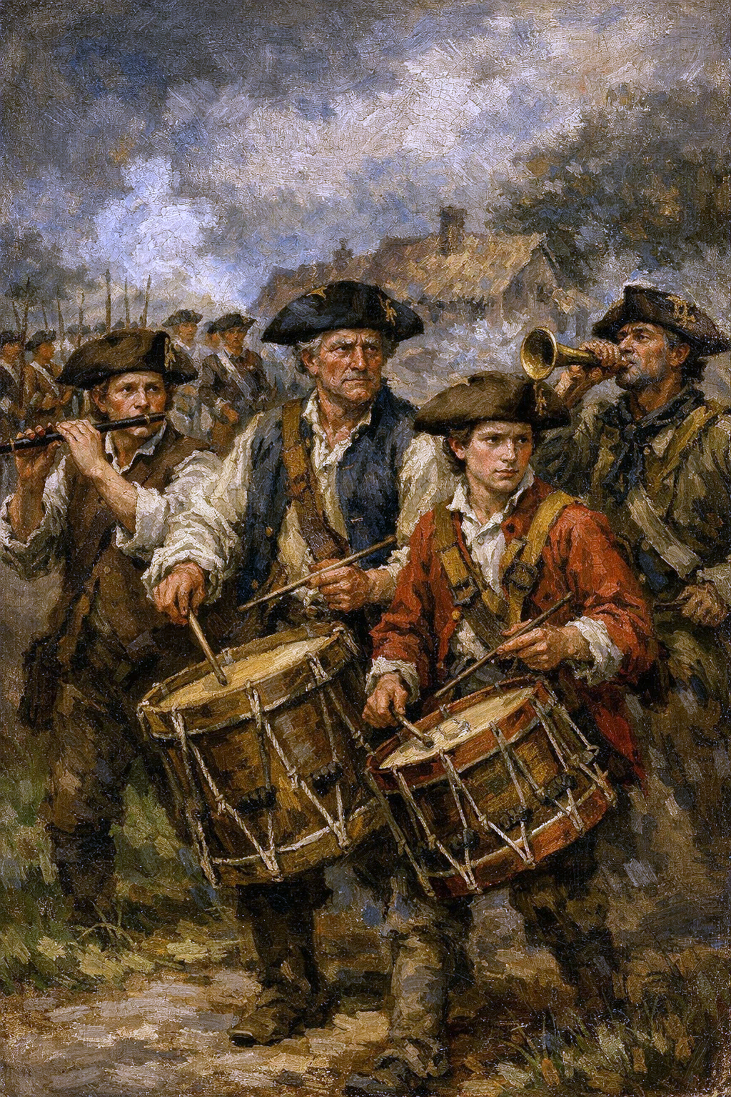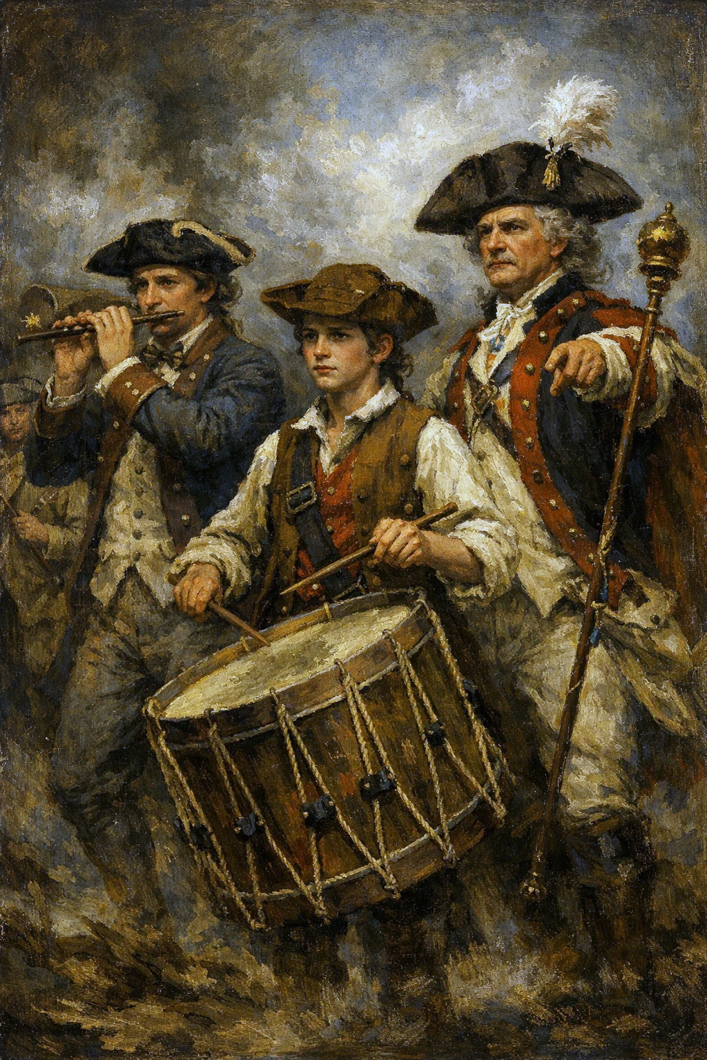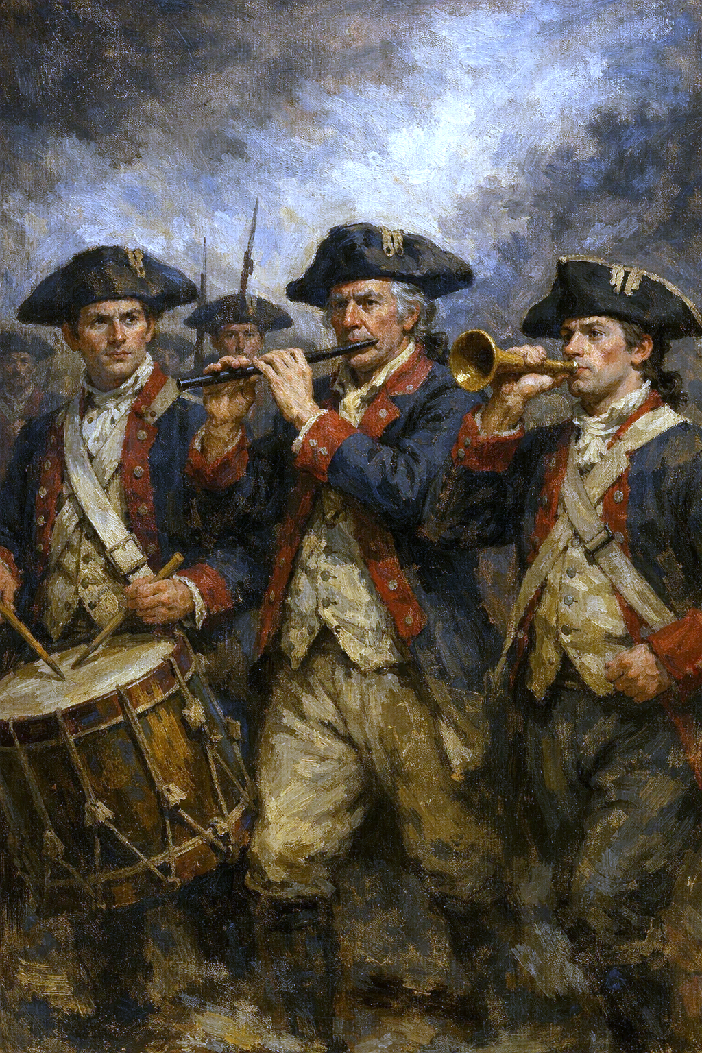 Strong snare drum rolls, clear fife melodies, energetic marching rhythm, An instrumental traditional military march inspired by the American Revolutionary War, Performed by a historical fife and drum corps using wooden fifes, rope-tension snare drums, and bass drum, Steady marching tempo, disciplined rhythm, ceremonial and patriotic atmosphere, No modern instruments, no orchestra, no electronic sounds, Feels like an 18th-century military parade or battlefield march, Authentic, raw, and historically accurate sound