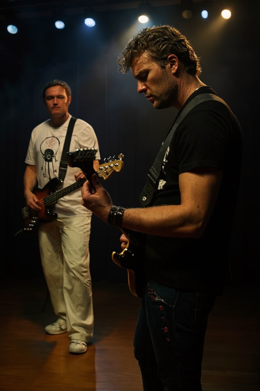 Dark Cinematic Post-Punk / Heavy Rock, 120 bpm, mechanical groove, cold fatalistic sleepless-city atmosphere, Urban sounds (subway rumble, traffic, metallic clangs) layer as textural foundation, Bass: relentless overdriven eighth notes, driving forward with industrial precision, Verses: lean but propulsive, tense muted guitar riffing drenched in delay and reverb, low-baritone Russian vocals carry restrained urgency and emotional weight, building palpable tension, Choruses: explosive action — dense aggressive drums with crashes and fills, bass octaves with syncopated push creating subtle double-time energy at 120 bpm, heavy distorted guitar walls, vocals break into intense emotional shouts with grit and desperation, Bridge: spoken word over minimal rhythm and distant urban decay, Guitar solo wails like a siren through concrete, screaming between buildings, End: sudden heavy hit, dying mechanical pulse, leaving unresolved tension and motion