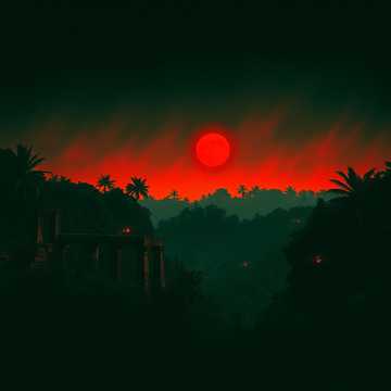 orchestral with deep guitar distortion and double kick drums, male chorus as background, metal, male is growly, jungle sounds, sounds of rain, orchestral music as background
