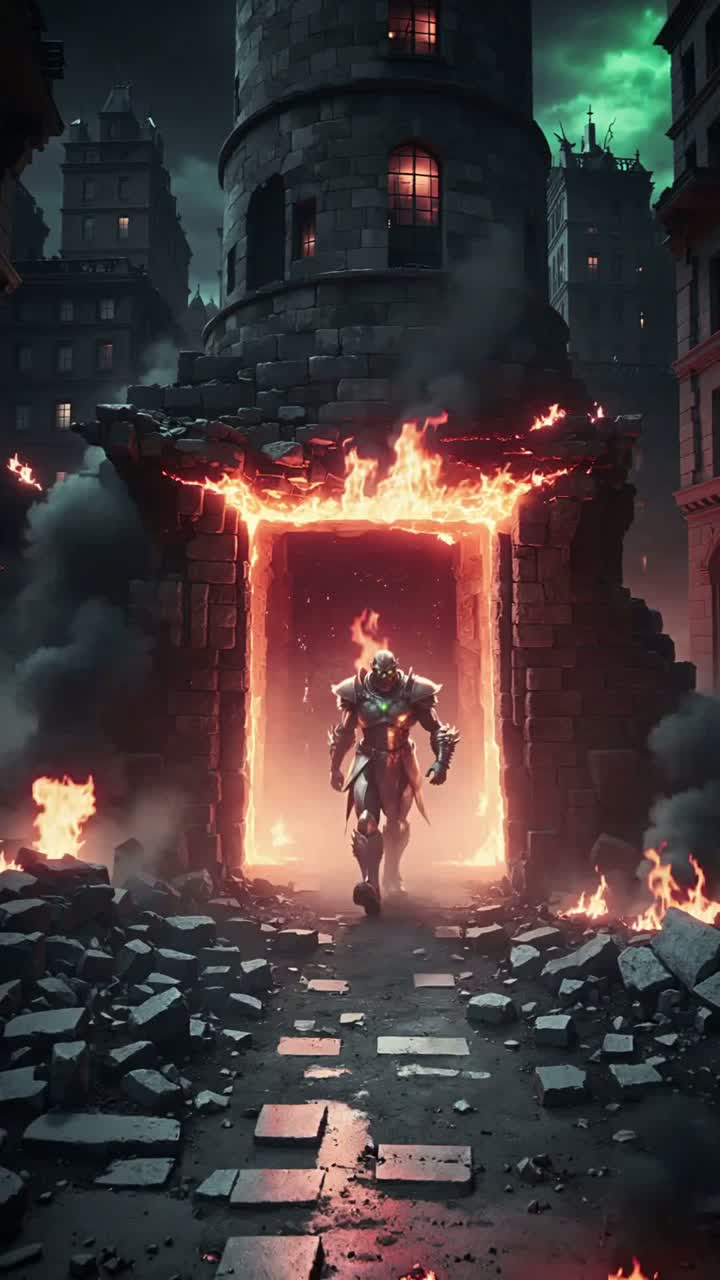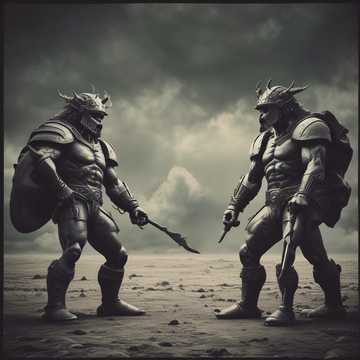 orchestral with deep guitar distortion and double kick drums, male chorus as background, metal, male is growly, steel crushing sounds, sounds of battle, orchestral music as background