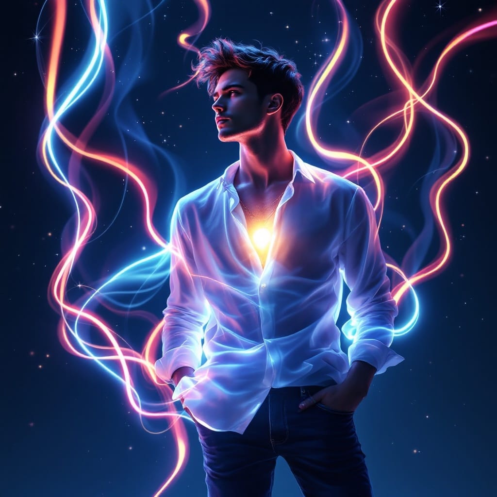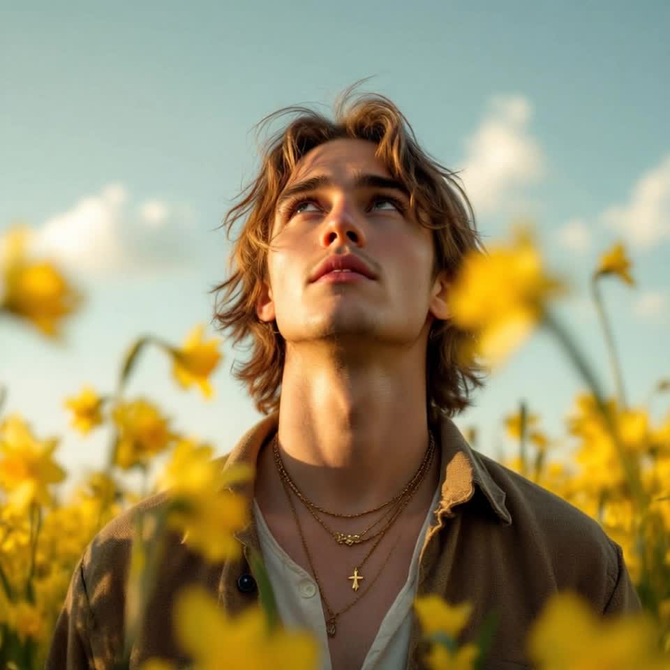 Instrumentation: Start with acoustic guitar and soft piano, add emotional strings gradually, Light heartbeat percussion, Atmospheric electric guitars in choruses, Shimmering synths and subtle choirs for cosmic bridge, Ethereal soundscape for whispered outro, Vocals: Sincere male voice, breathy and poetic, Introspective during verses, harmonies in choruses, occasional falsetto for emotional peaks, Production: Ambient pads suggesting spring awakening, spacious reverb expanding for cosmic sections, warm mix prioritizing vocal clarity, Build layers gradually, reach emotional peak at bridge, then fade to whispered conclusion, ‑female vocals, ‑female voice
