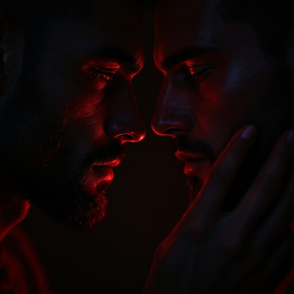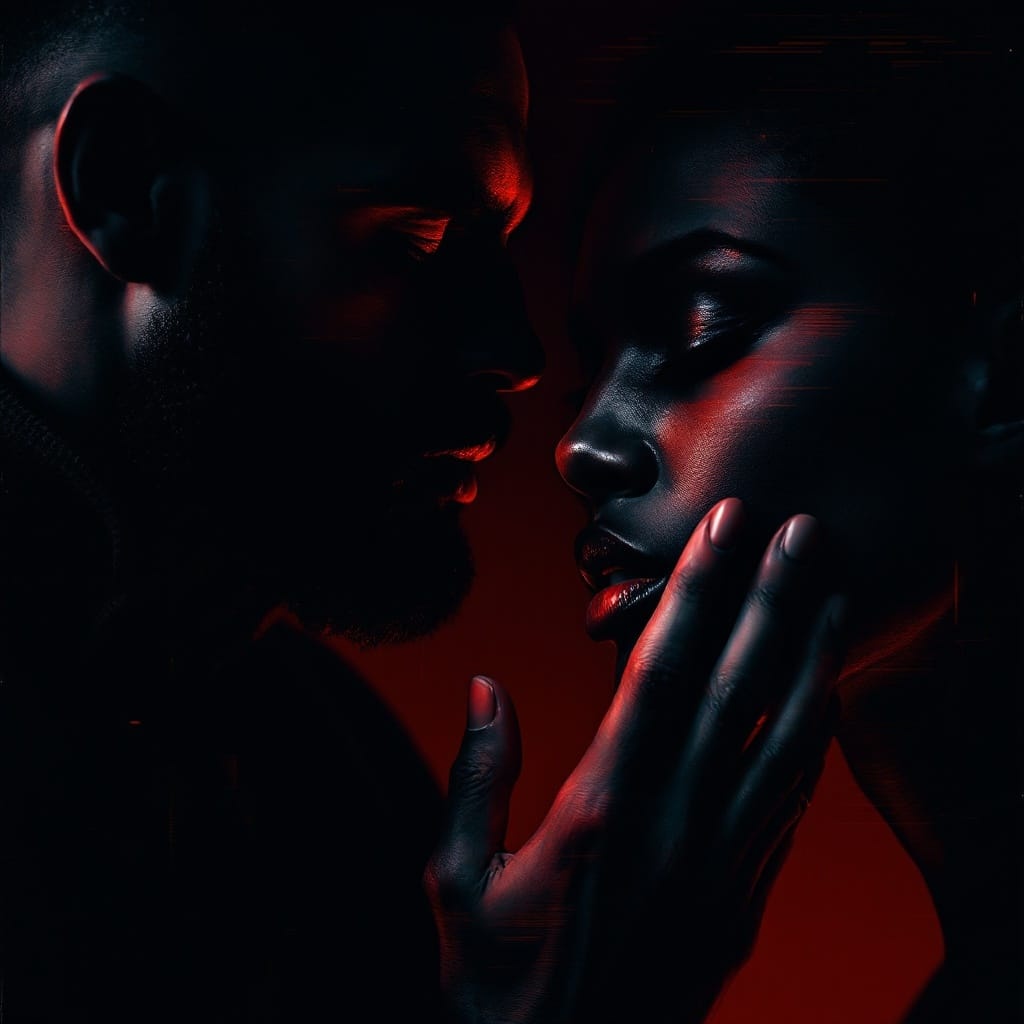 Heavy, pulsating electronic beats with gritty synths, deep bass lines, and aggressive rhythms, Emotive, male vocals blending seduction and menace, creating a darkly sensual industrial atmosphere
