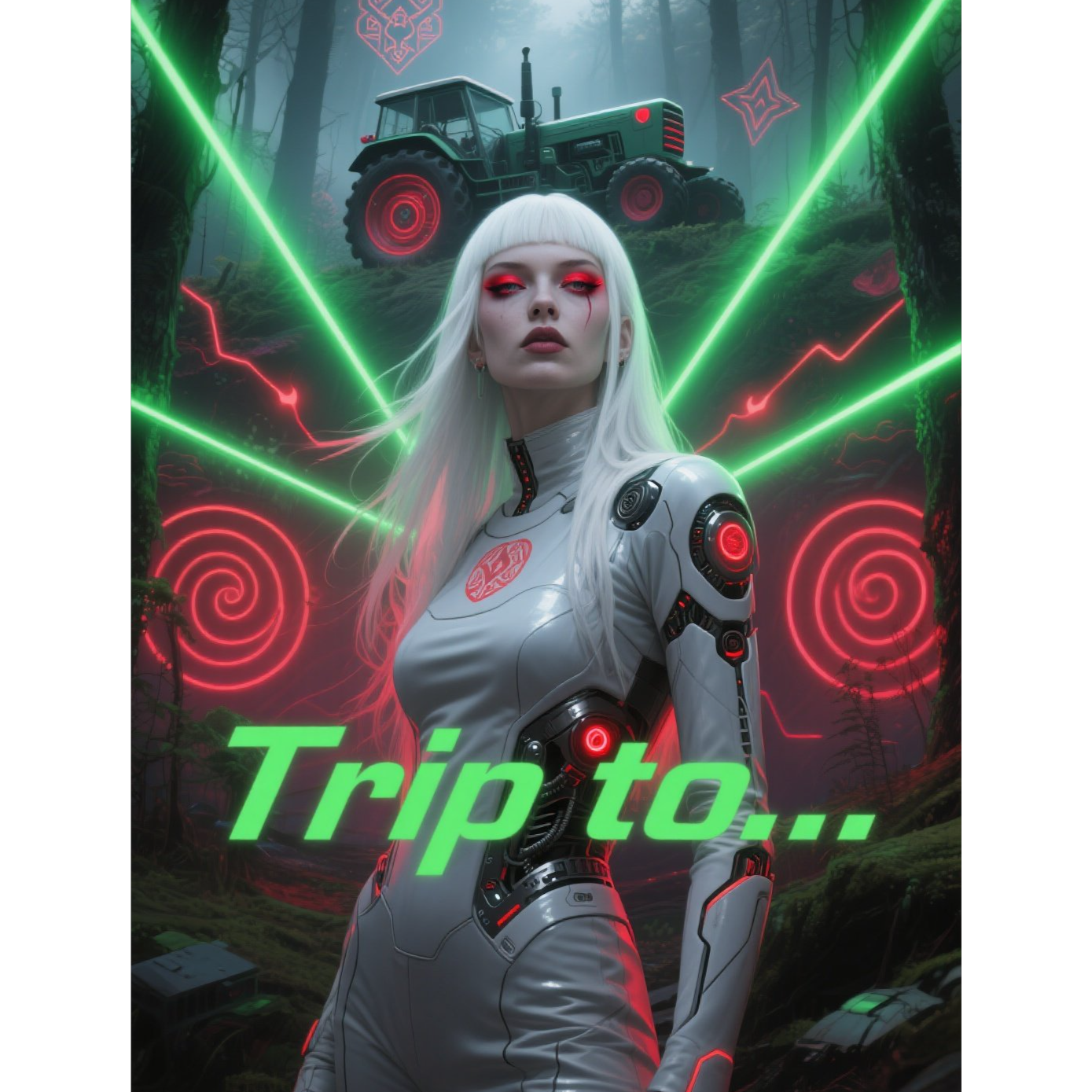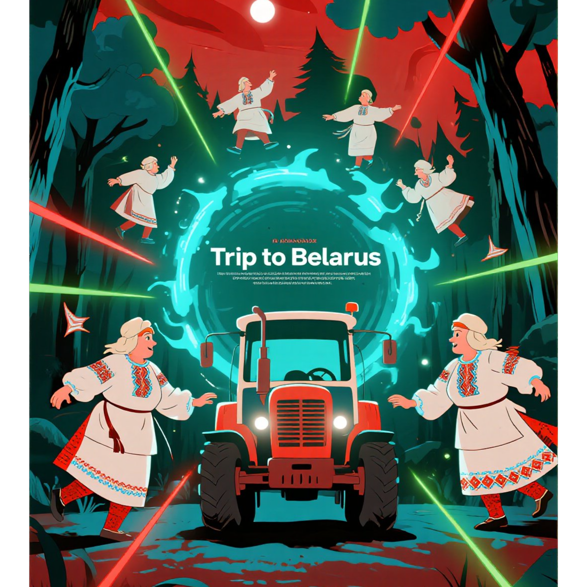 Ultra-energetic Frenchcore, uptempo rave track inspired by Dr, Peacock’s “Trip to…” series, but performed by Jane Jekkinz - playful, electric, chaotic but melodic, Fast BPM (190–210), pounding kickdrums, rolling bass, acid-trance leads, rave whistles, distorted pads, Slavic folk-motifs sampled as bright hooks, Lyrics: fun, hypnotic, catchy; mix English with a few Belarusian shout-phrases (“Добрa дзень!”, “Паехалі!”, “Беларусь танчыць!”), Vibe: surreal rave-journey through Belarus - forests, panelki, tractors-as-rave-machines, cosmic folk spirits dancing, Chanty chorus, call-and-response, festival energy, wide stereo, glitchy vox, uplifting madness but clean production
