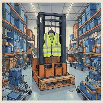 Outlaw country, upbeat honky tonk shuffle, humorous workplace storytelling, male vocal with conversational delivery, slightly frantic but rhythmic energy, acoustic guitar driven with light electric twang, steady bass line, brushed drums, occasional harmonica accents, truck stop Americana feel, satirical retail warehouse theme, POV narrative from a safety spotter, chaotic but organized tone, lively and cinematic country groove, 1970s classic country influence, warm analog production