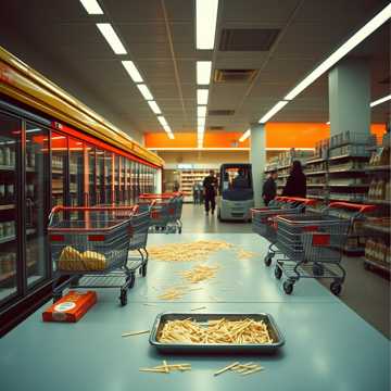 Upbeat outlaw country shuffle, comedic retail storytelling, male conversational vocal, light twang electric guitar with acoustic rhythm foundation, brushed drums, walking bass line, harmonica accents, crowded supermarket atmosphere, POV observational lyrics from floor worker perspective, humorous chaotic energy, 1970s classic country influence, warm analog production, cinematic grocery store scene, lively but slightly overwhelmed tone
