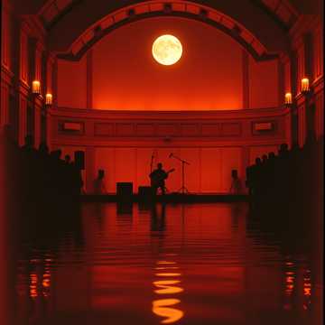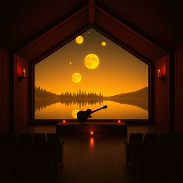 A deeply moving ambient guitar performance for restorative, emotion-touched sleep, live in a small, candlelit intimate concert hall, a lone fingerstyle acoustic guitarist draws slow, hypnotic open-tuned arpeggios and rich chord voicings in a low, warm minor key, A haunting, lyrical melody gradually emerges atop the arpeggios—like a tender lullaby evoking nostalgia, quiet longing, and peaceful emotional release—notes blooming and lingering like soft sighs before fading, Nidway, subtle e-bow sustains and distant violin harmonics drift in, adding shimmering ethereal layers like moonlight on still water, deepening the wistful beauty, Whisper-quiet throughout (ppp to pp), with delicate breathing swells that heighten emotion before dissolving into endless calm, Lush hall reverb captures faint audience breathing and soft chair creaks for comforting, authentic human presence, Tempo: 40-50 BPM, Style: neoclassical ambient, cinematic, deeply melodic sleep aid with intimate woody