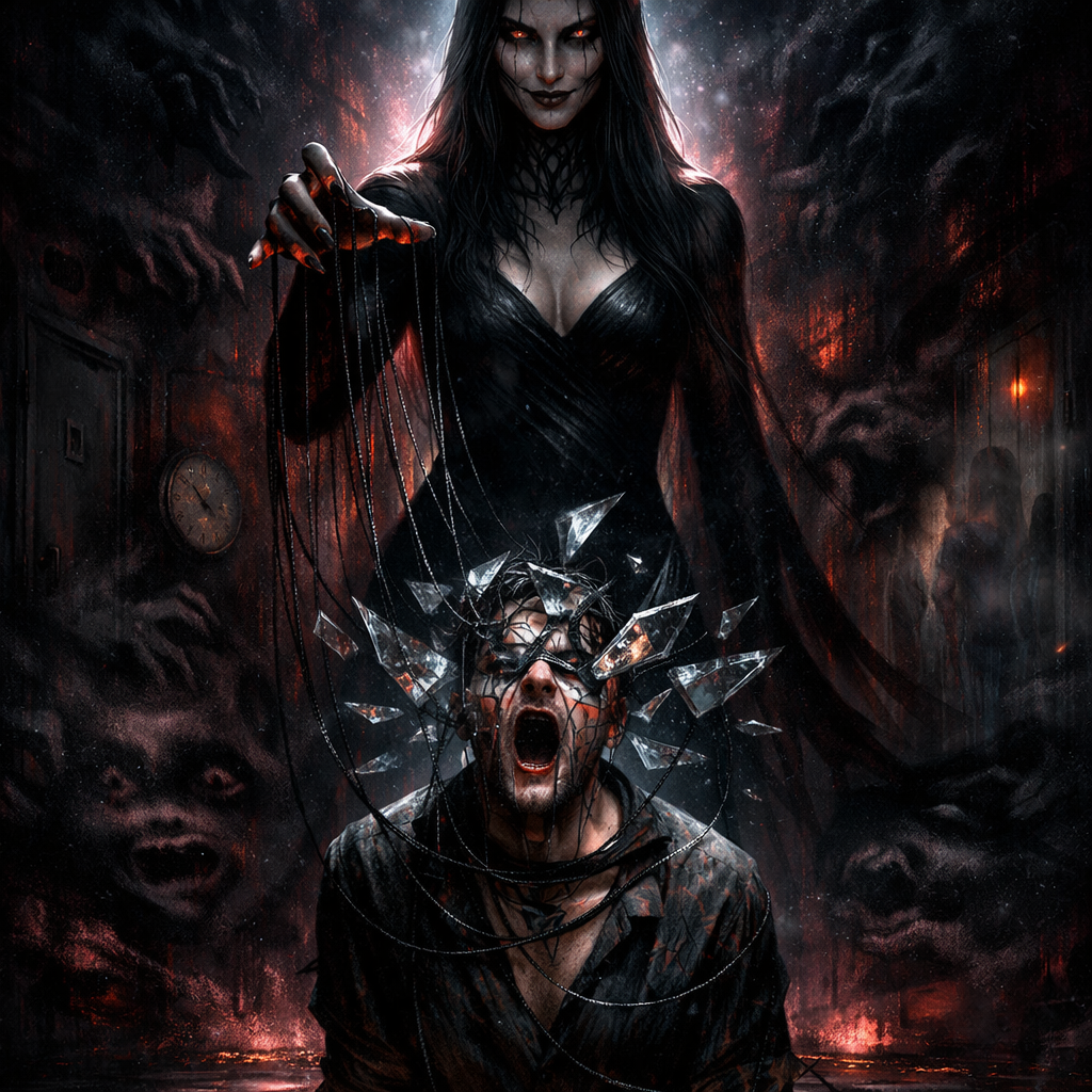This track layers deep sub-bass and buzzing, glitched beats with sharply panned 3D audio effects, immersing the listener in a sinister, enveloping soundscape, Soothing female vocals float above menacing textures—knife-scraping foley and glitch FX swirl around urgent staccato violin arpeggios and dark cello progressions, creating relentless pressure and an unsettling, horror-infused drive
