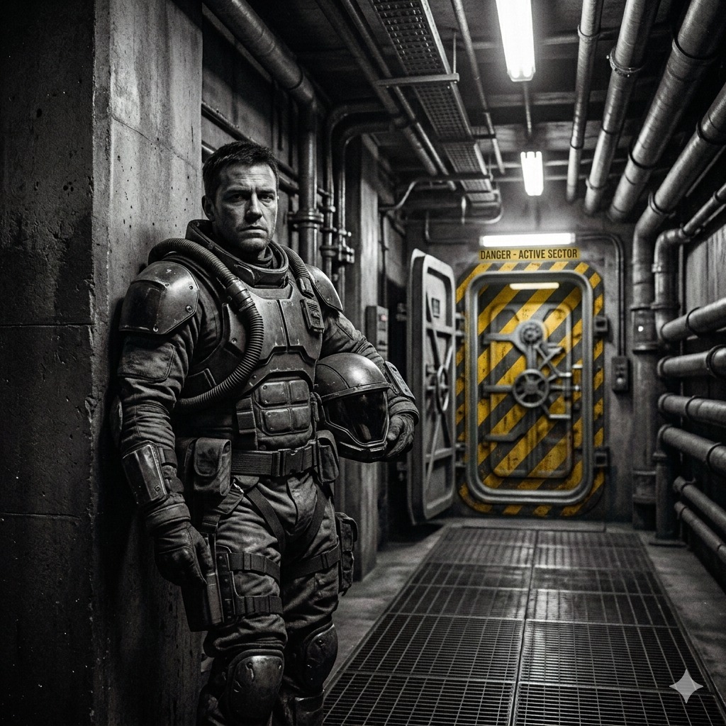 Cinematic Synthwave / Dark Retro-Electronic, 120–130 BPM, 432 Hz, sofortiger Start ohne Intro, Analoge 80s-Synths mit höherer Intensität, aggressiver pulsierender Sequencer-Bass, drängende dunkle Arpeggios, schwere modulierte Drones, metallische Texturen, unterschwellige Alarm-Signale, Minimalistischer, militärischer Beat mit konstantem Vorwärtsdruck, mehr Energie, mehr Spannung, keine Club-Drops, Tiefe männliche Stimme, kontrolliert, ruhig, angespannt, klar verständlich, wie ein Einsatzprotokoll, Helle weibliche Stimme als ferne Essenz-Ebene, hallend, warnend, Atmosphäre: unterirdische Marsbunker, Astralsoldaten in Bereitschaft, kaltes Licht, rote Staubfilter, Stille vor dem Einsatz, Warten zwischen den Missionen, angespannte Ruhe, unterdrückte Gewalt, Gefühl von eingesperrter Kraft, Disziplin, Erwartung, Eskalation ohne Explosion, Nostalgisch-futuristisch, Stranger-Things-Vibe, mehr Power, mehr Druck, wie eine militärische Transmission kurz vor dem Einsatz