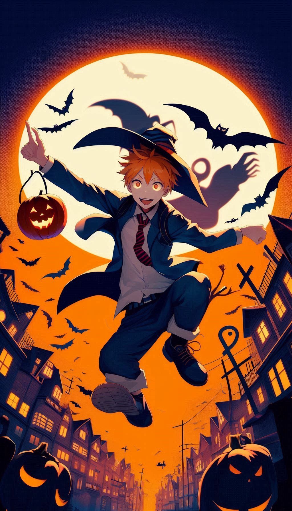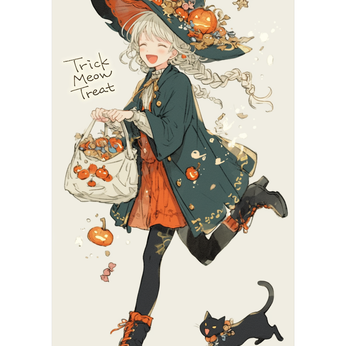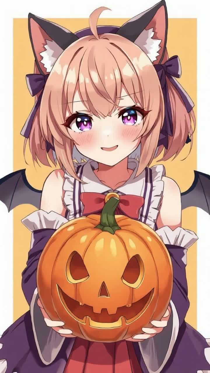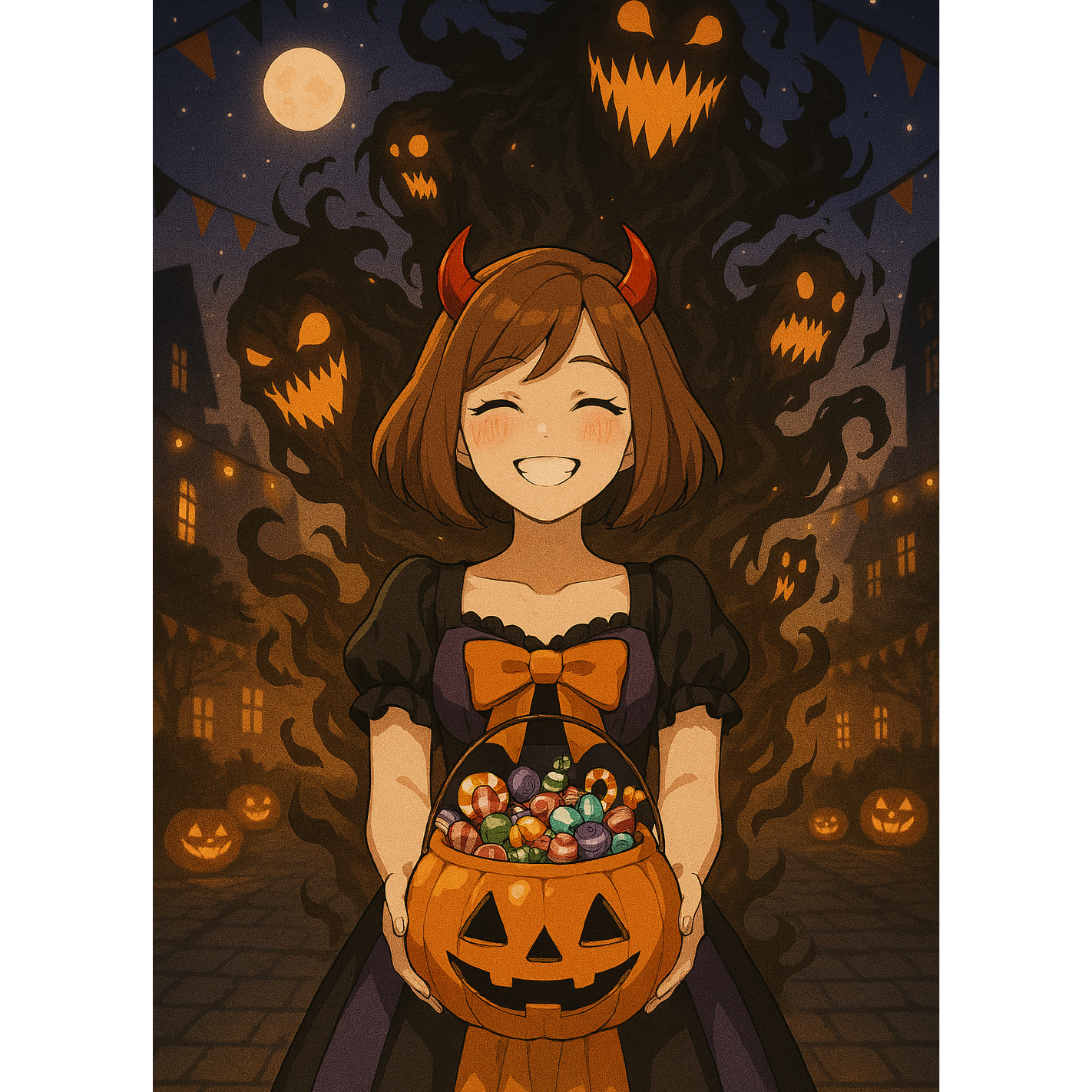 A fast and playful J-Pop Halloween song with a cute young female vocal, cheerful yet slightly mischievous tone, The style mixes pop rock and EDM with bright synths, clapping beats, and spooky carnival soundsâghostly âwoo~â, cat meows, witch laughter, and toy bells, The rhythm should bounce like children running through moonlit streets, Melody is catchy, full of energy, and perfect for an anime-style Halloween festival, Include call & response chants like âTrick or Treat!â, âKyun Kyun Magic!â, and âPumpkin Soul Parade!â, Add layers of sparkling synth arpeggios and festive brass hits, The chorus bursts with candy-colored harmonies and playful shouts, Lyrics should celebrate Halloween nightâcostumes, pumpkins, sweet magic, and friendly monsters dancing under orange lights, At the bridge, insert a dreamy moment with soft piano and distant laughter, then explode into a final chorus with full instrumentation, fireworks, and joyful chaos, End with a giggle and fading chime sound