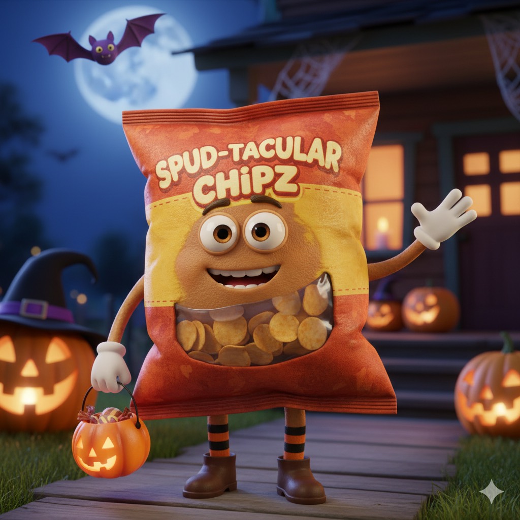 A playful, upbeat Halloween pop song with a quirky, spooky vibe, The track blends eerie synths, jingling bells, and a bouncy rhythm to evoke a moonlit trick-or-treat adventure, Lyrics center on a candy-obsessed dreamer who dresses as a shiny potato chip to collect a lifetimeâs worth of sweets, Include the catchy chorus: âTrick or Potato, tonight my potato costume sparkles bright, carrying my simple candy dream!â The tone is fun yet slightly spooky, with verses about trembling at scary costumes but staying determined to score treats, Add Halloween elements like ghostly giggles, creaky doors, and glowing jack-oâ-lanterns in the background, Keep it whimsical, with a touch of mischief and a focus on the joy of free candy and potato-themed pride