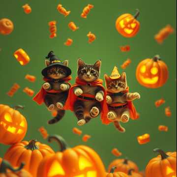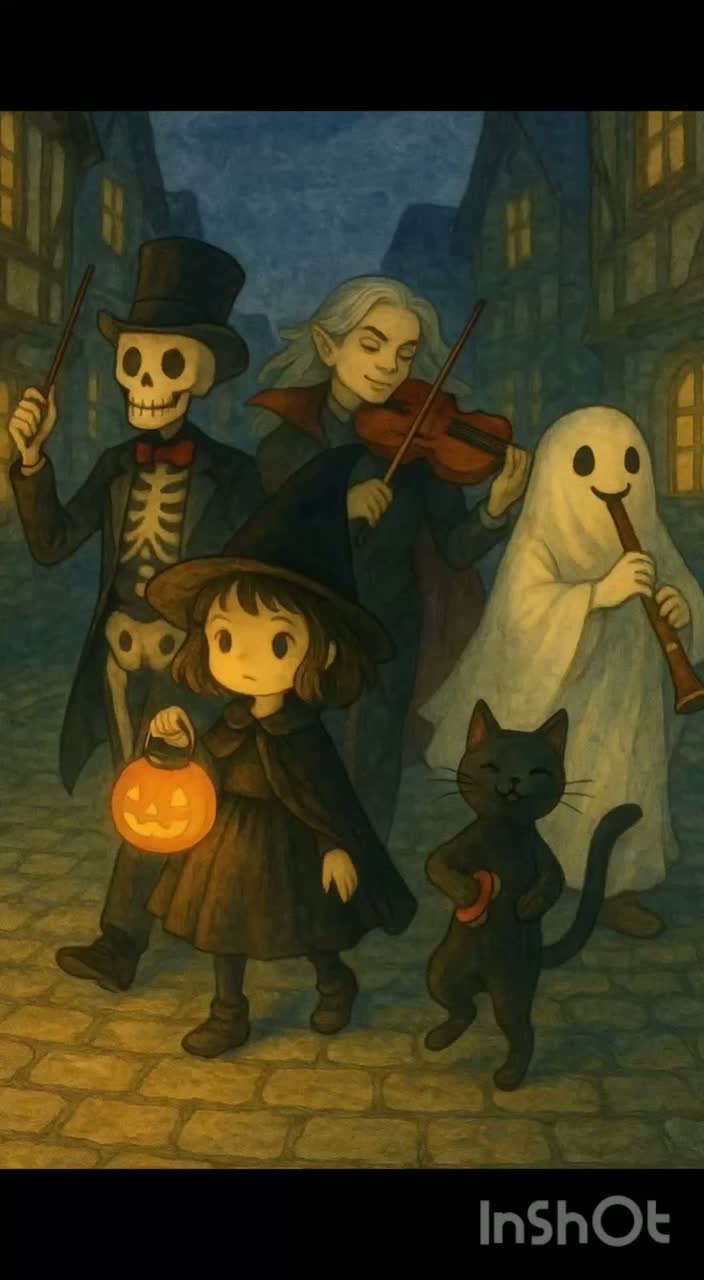 spooky jazz pop, halloween parade, cute and cinematic, cats singing "meow" with few human words like "Trick or Treat" and "Happy Halloween"
