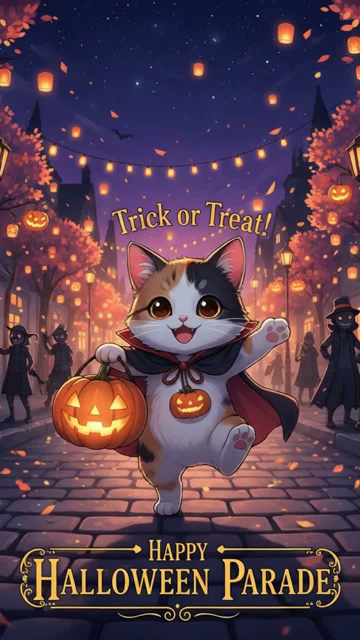Overall mood: Festive, colorful, energetic, fun â a Halloween night carnival parade led by a calico cat