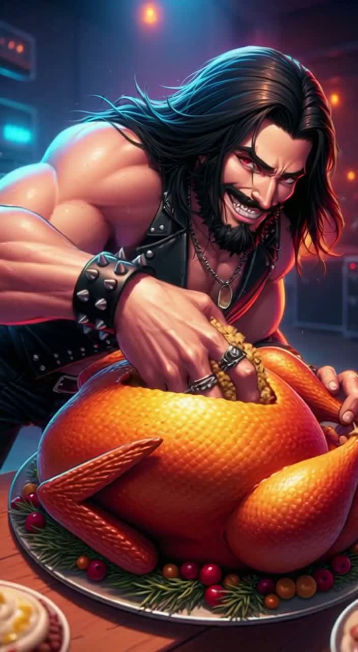 Explosive glam metal kicks off with pounding drums and wailing electric guitars, layered with cheeky samples of clinking silverware and bubbling gravy weaving through riffs, Verses are dynamic and chaotic, with theatrical choir and organ stabs in choruses, Epic guitar solos soar above roasting turkey sizzles, building into dramatic crescendos, The hook is bold and instantly singable, fusing metal bravado with irreverent, festive textures for a playful, crowd-rousing finale