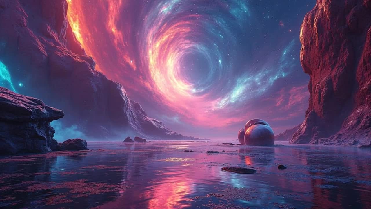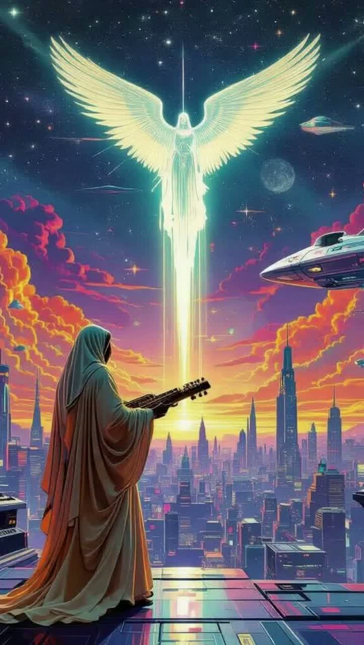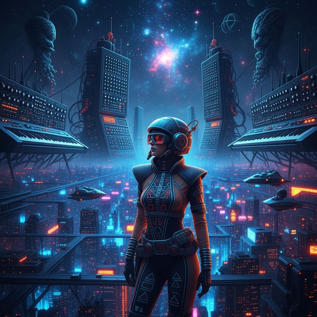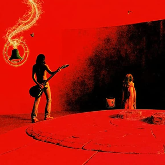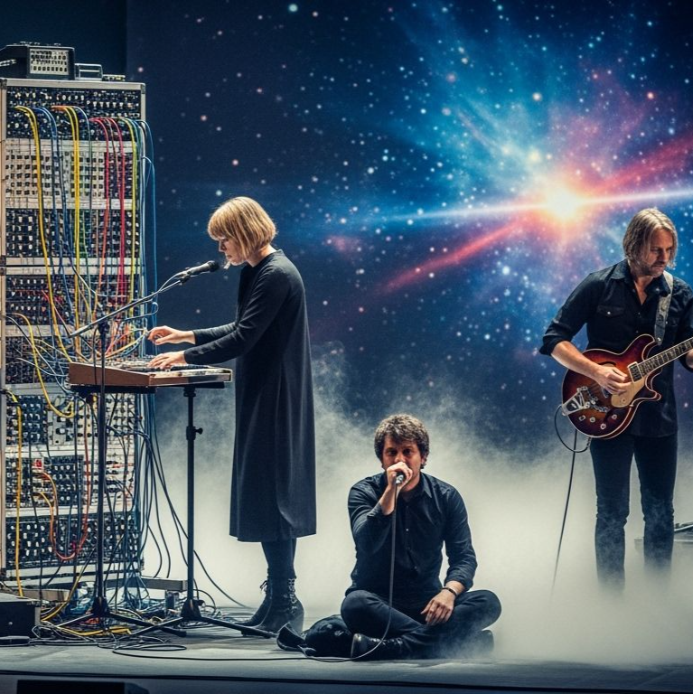 layered clean guitars, glockenspiel, organ pads, soft bass, tribal drums, gradual build-up, cinematic, mystical, ends with fade-out, Prog-Rock-Modulationszillator-Vintage 1960er Teisco Echo Box Röhrenverstärker Reverb Unit Red Swirl Tolex eine frau aus spinnwaben mit guitarcosmic dust and starlight, plays a melody that warps reality, He stands on a fractured, crystalline planetoid, bathed in the ethereal glow of distant, candy-colored nebulae, The style is reminiscent of psychedelic, with vibrant, swirling colors and intricate, mind-bending patterns, influenced by the visualizers of classic Krautrock bands and the surrealism